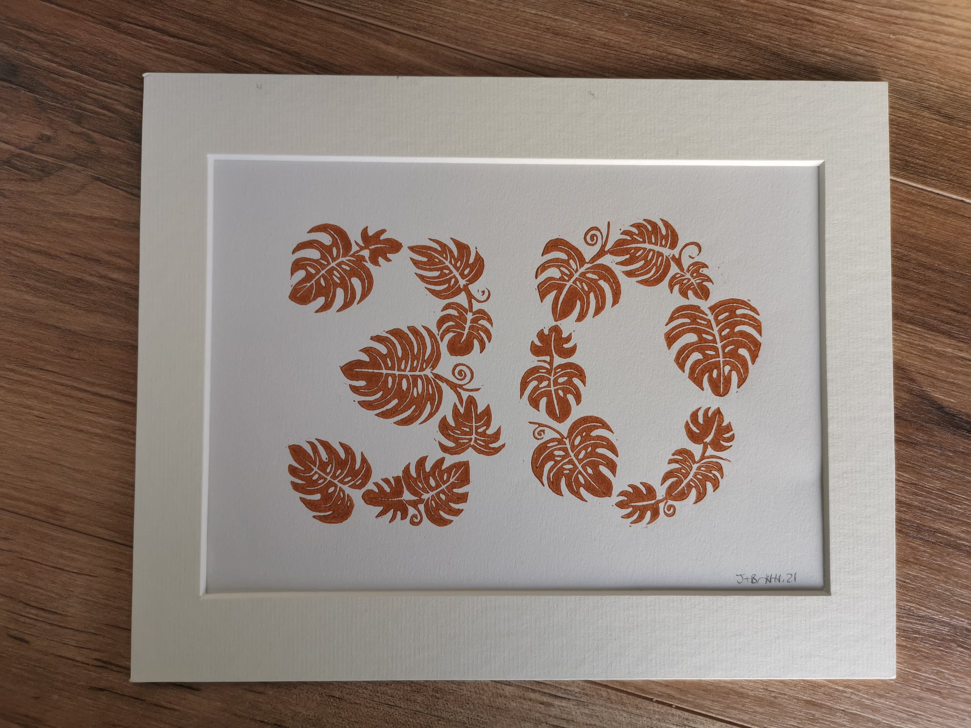 Special age monstera leaf lino cut art print birthday, anniversary gift