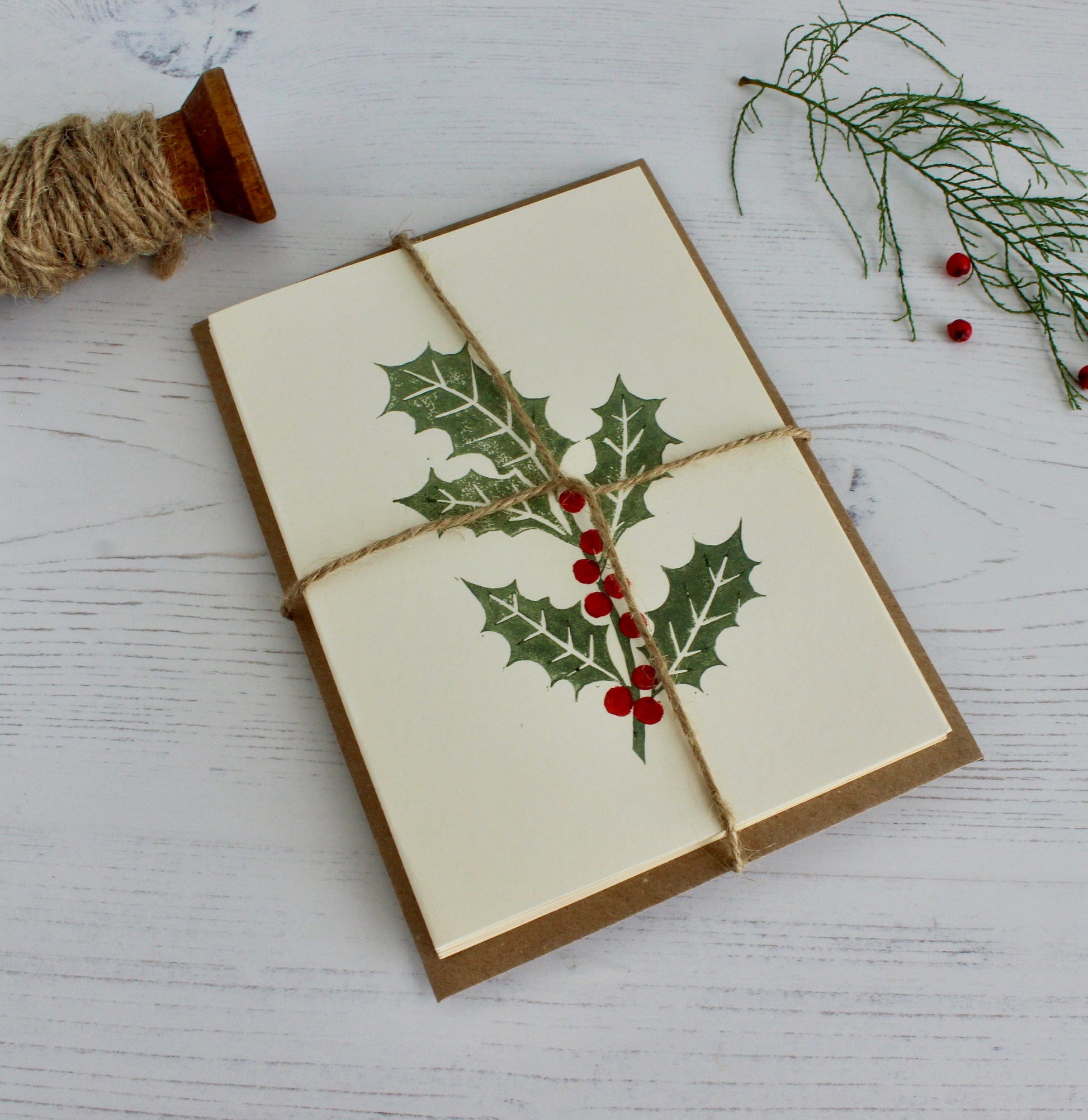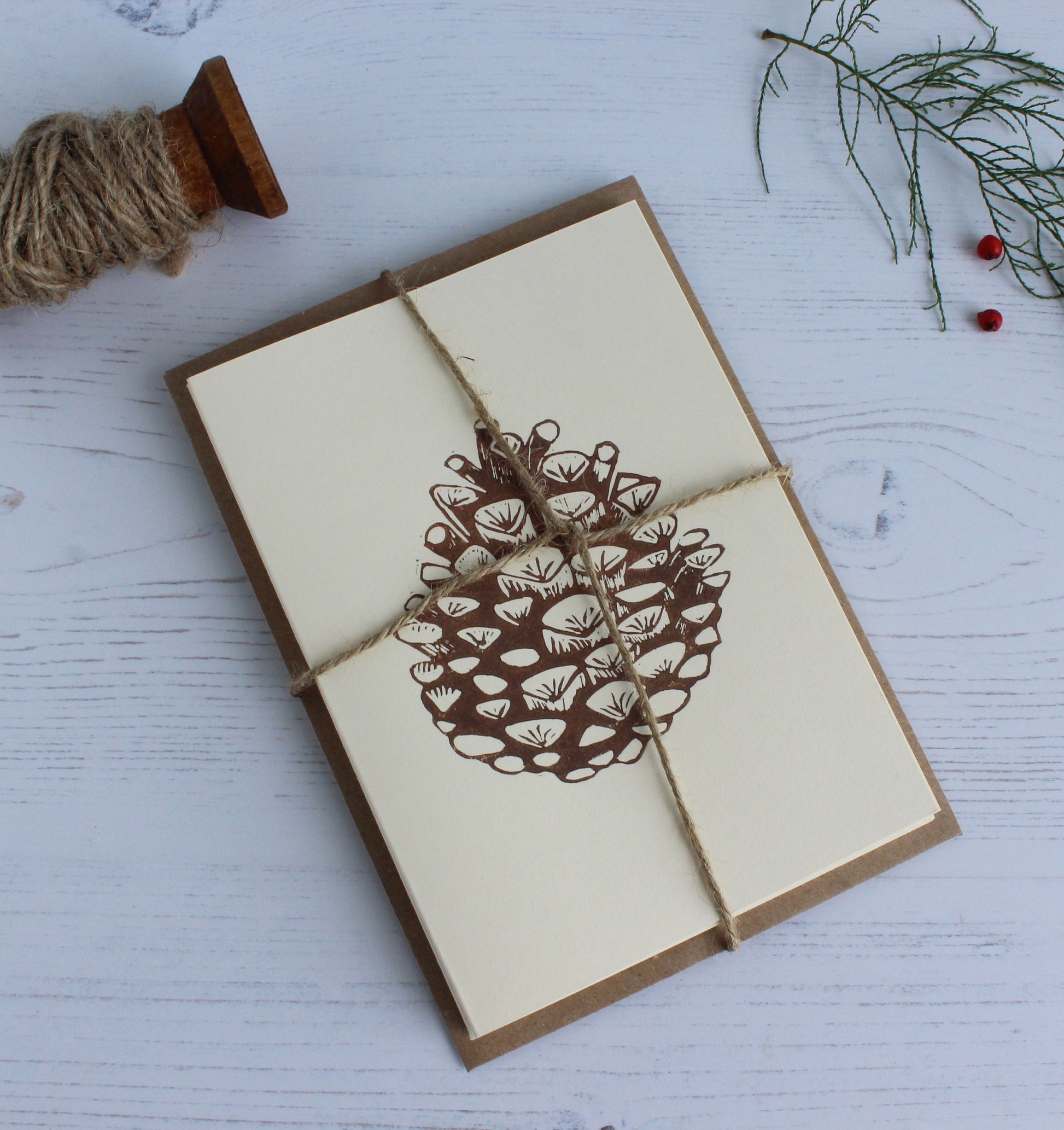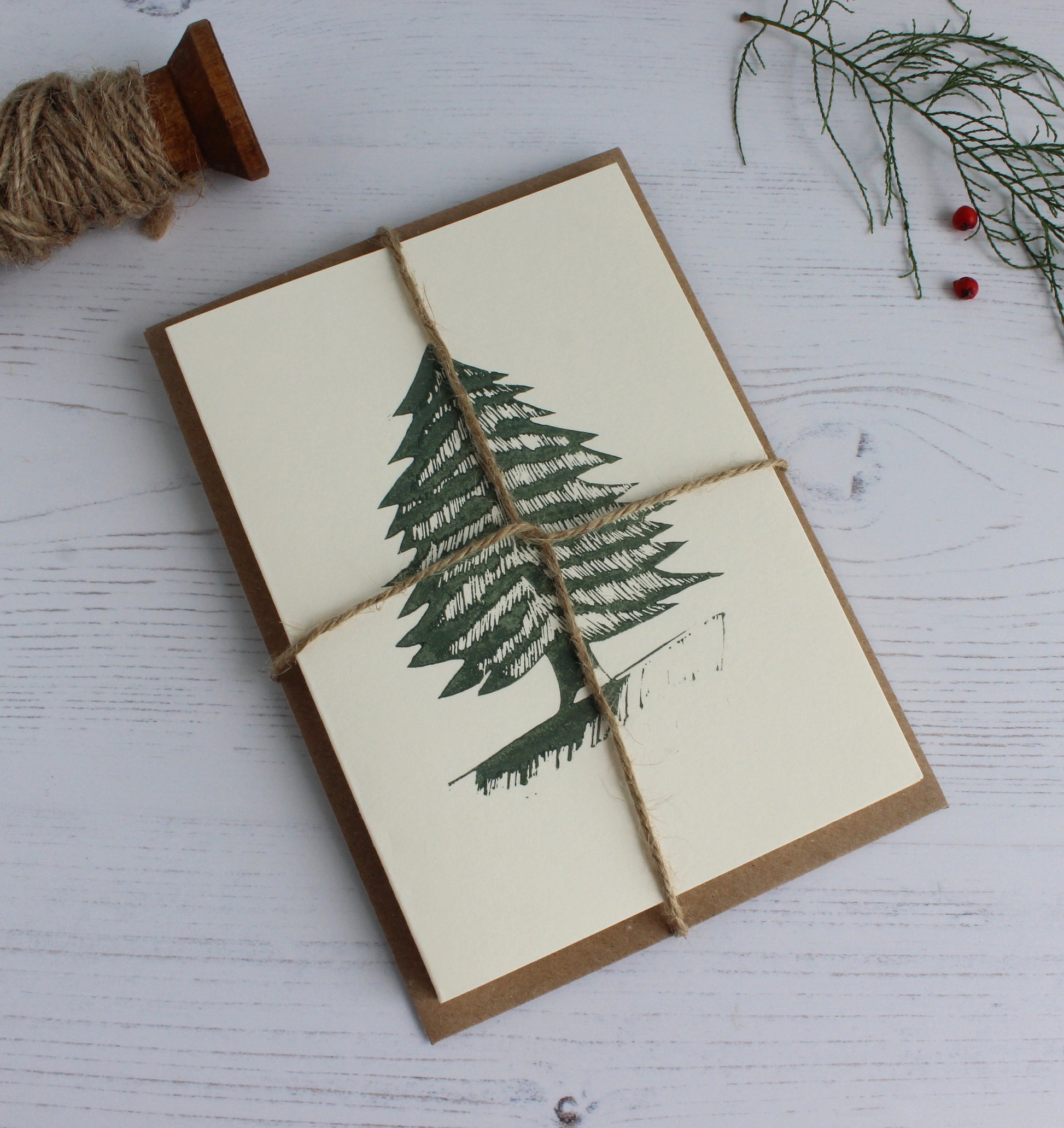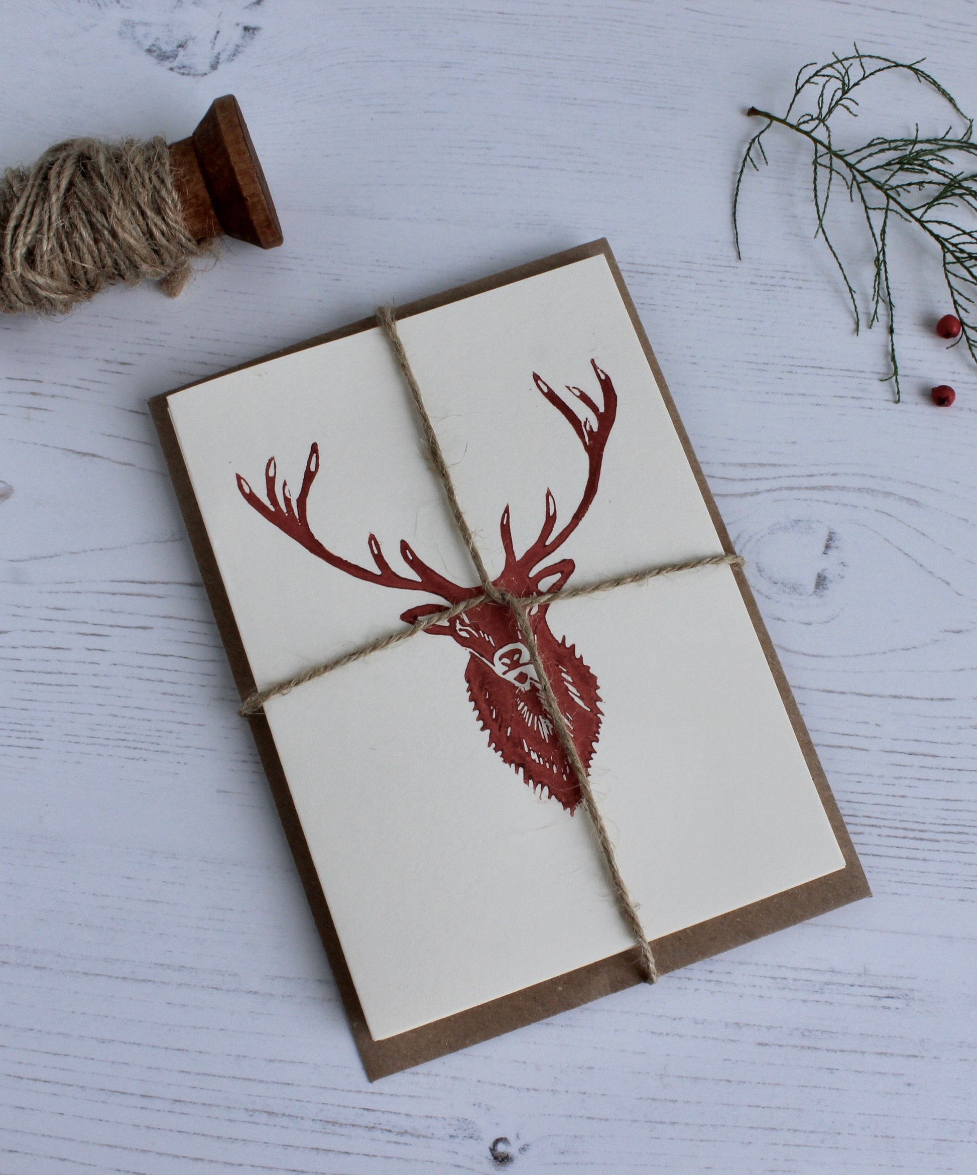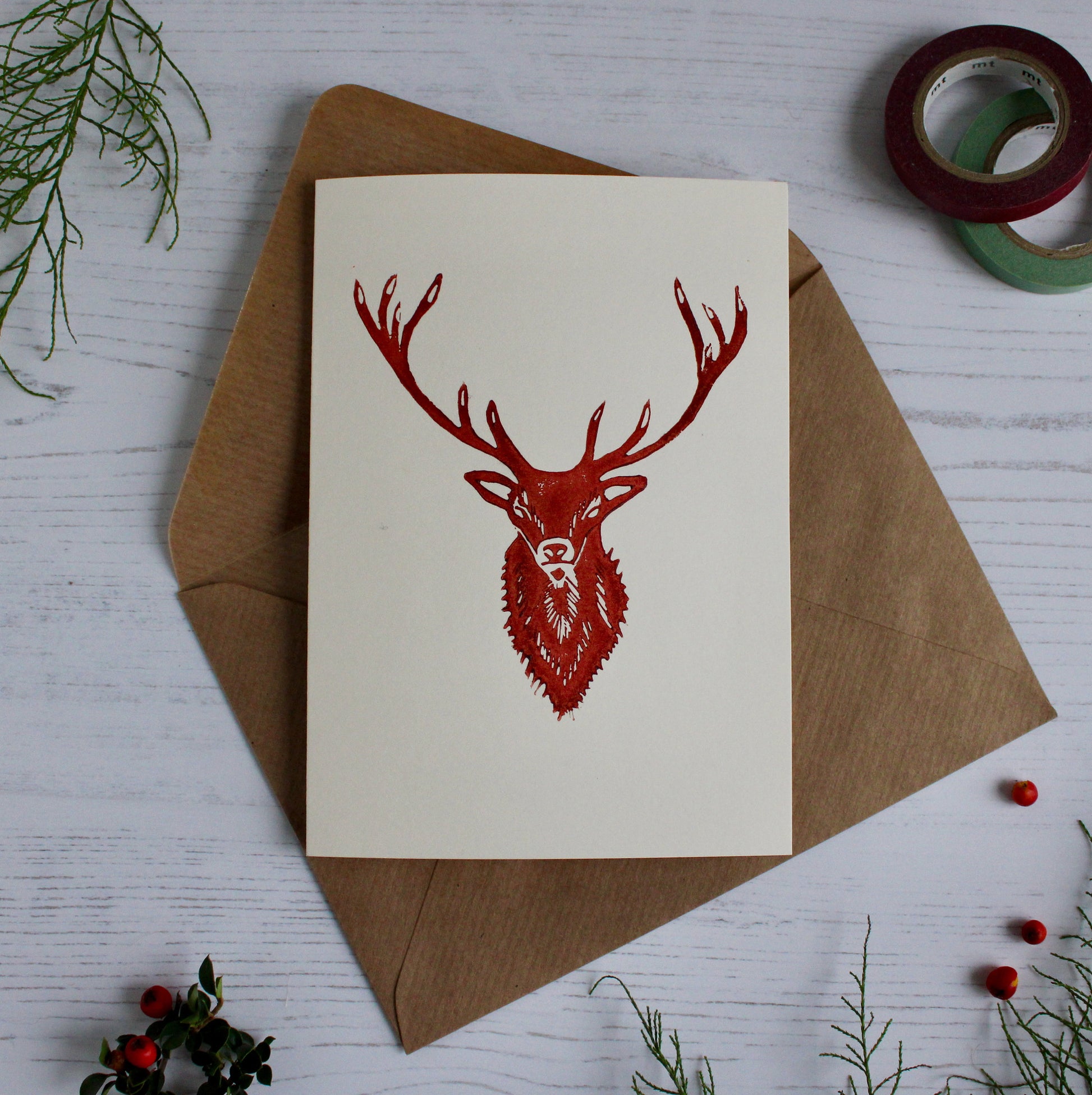From our original Lino-cut prints; this pack contains 1 of each design: Red Stag, Pine Christmas tree, Holly, Pine Cone and Robin.