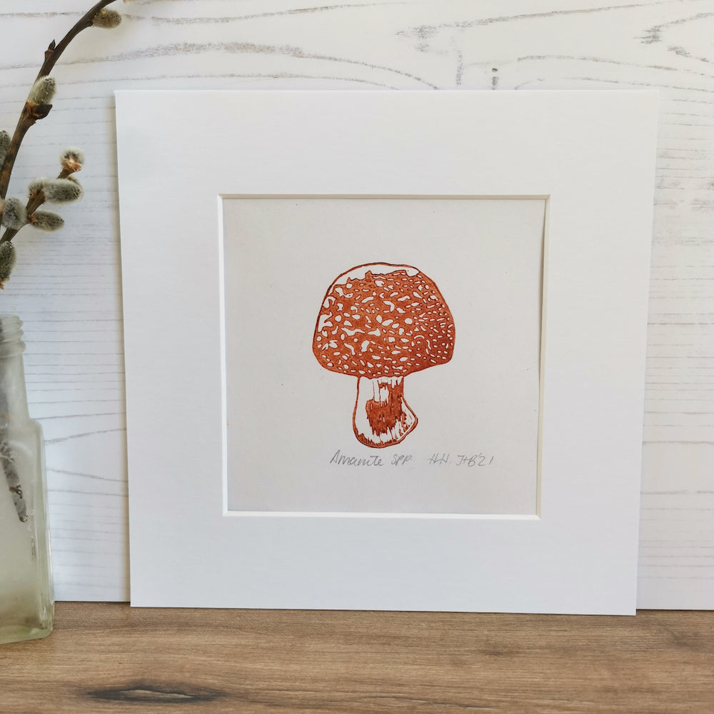 Our lino print of an amanita app. of toadstool is inspired by fungi spotting in U.K woodlands. Printed by hand they are an ideal present for nature lovers and those interested in natural history.