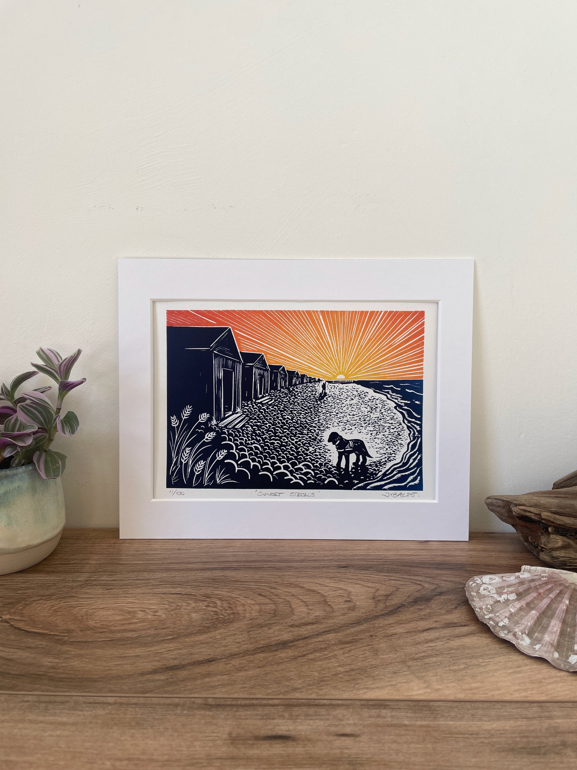 Hand made original linocut print of beach scene inspired by the North Kent coast, the print features a dog walking over a beach hut lined pebble beach with sunset.