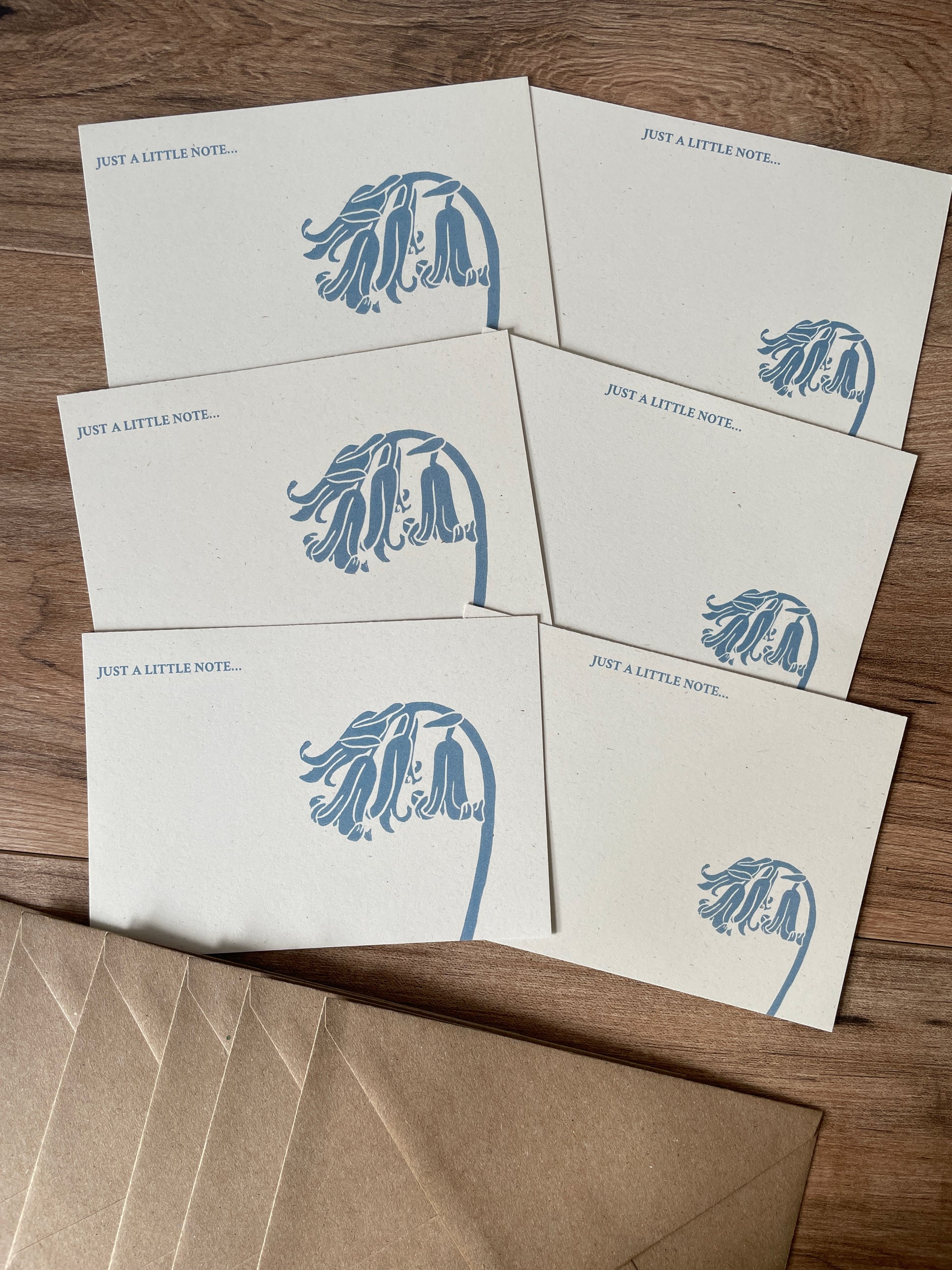 Our Bluebell Notecards are crafted with our unique linocut print design, perfect for those who love bluebells. Each set includes 6 notelets and 6 envelopes, featuring two variations of our linocut design and the text "JUST A LITTLE NOTE...".