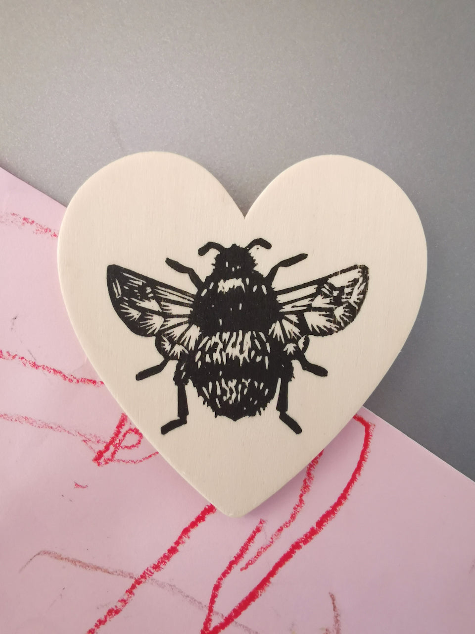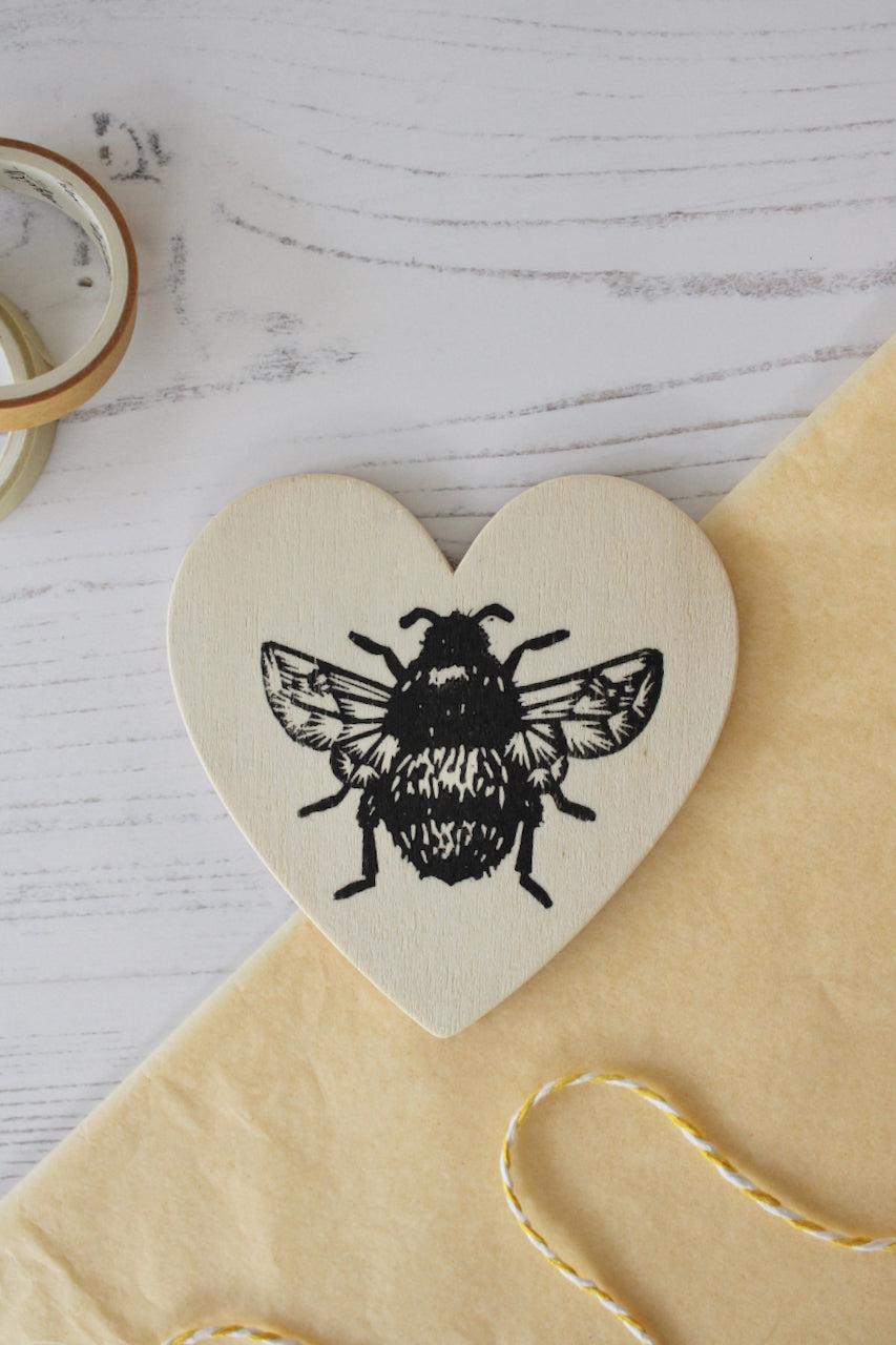Bumblebee linocut design hand printed using black block ink on 3mm thick plywood heart.