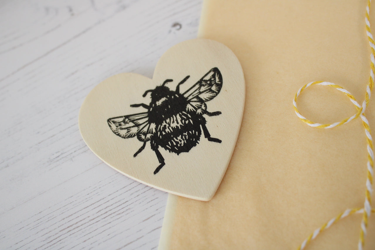 Our hand printed linocut wooden heart magnets are an ideal little gift for wedding favours. Say thank you with this bumblebee heart magnet.