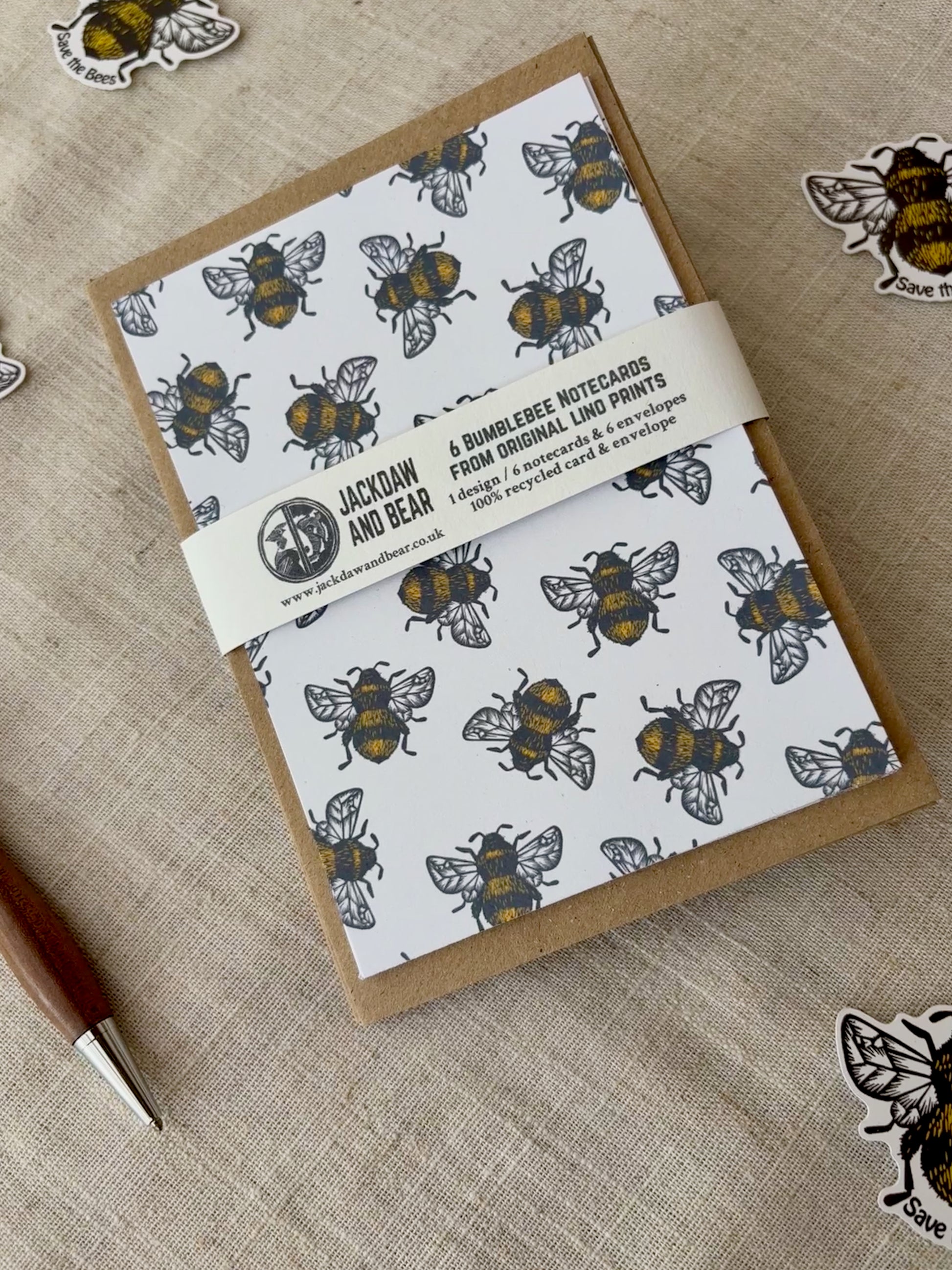 A charming set of 6 A6 single-leaf notelets featuring our original hand-carved bumblebee linocut design.