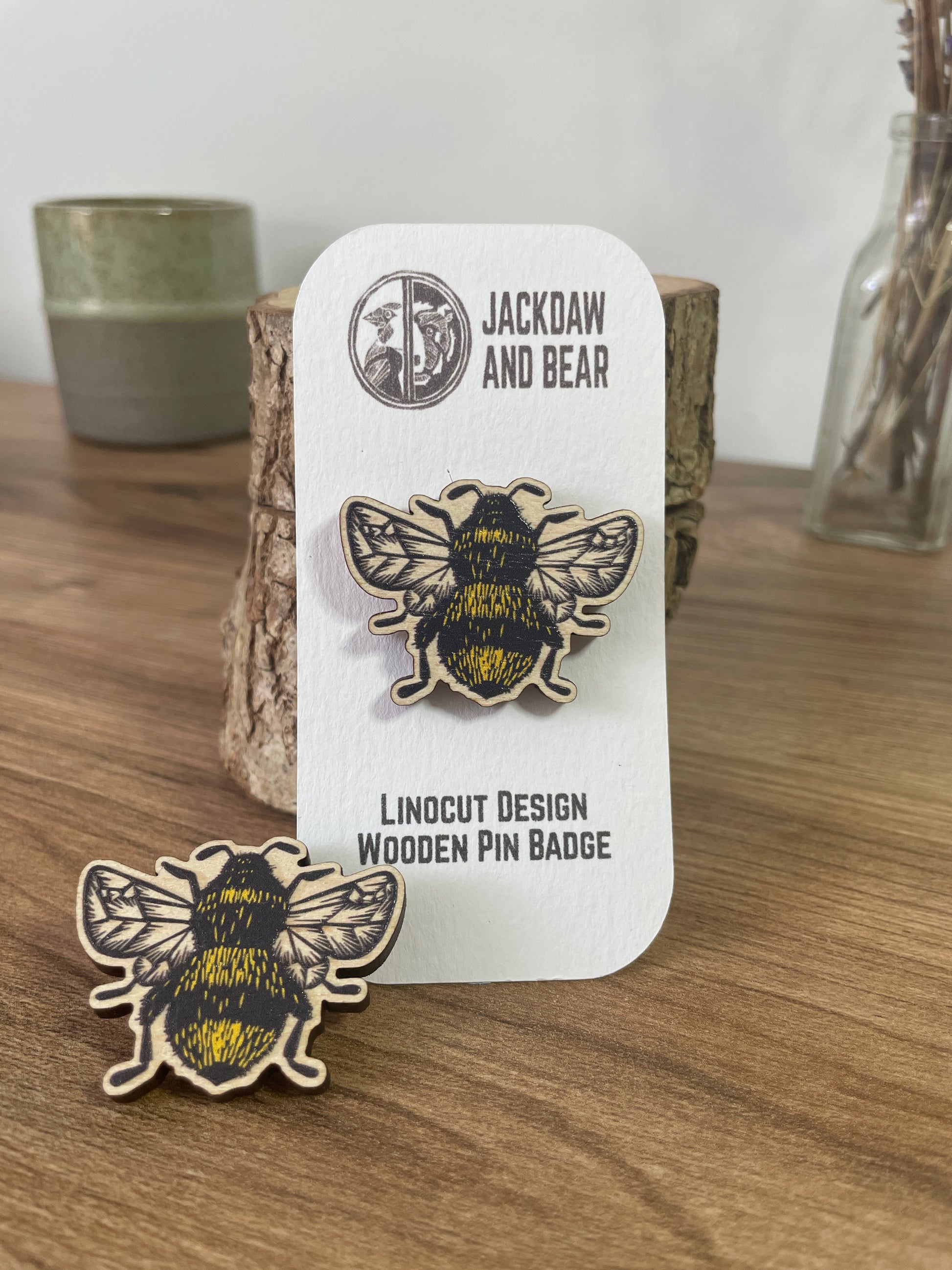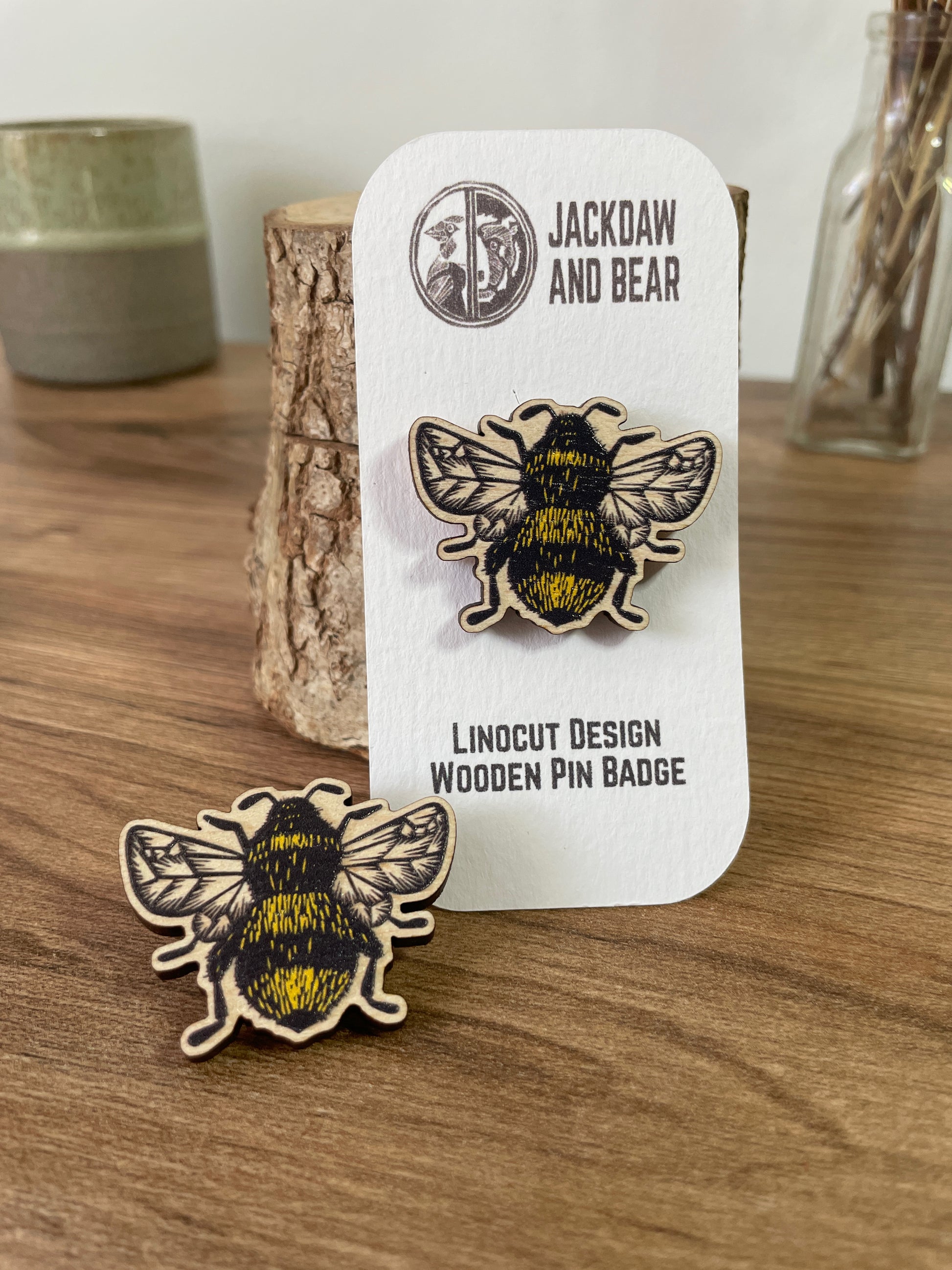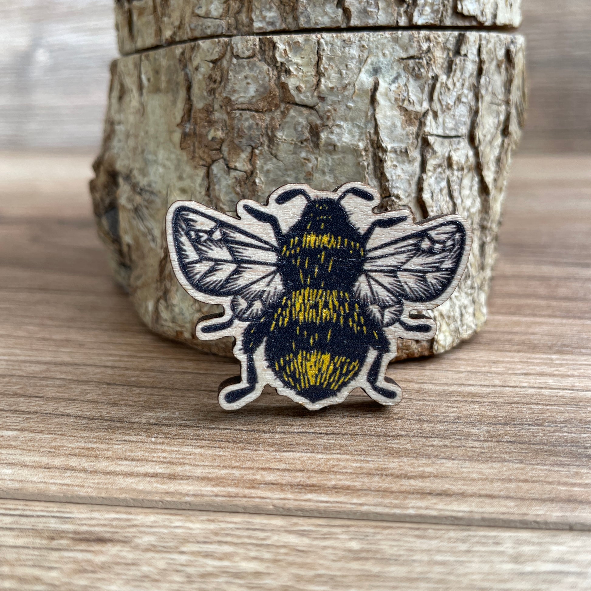 Bumblebee Wooden Pin Badge - animal, nature brooch.