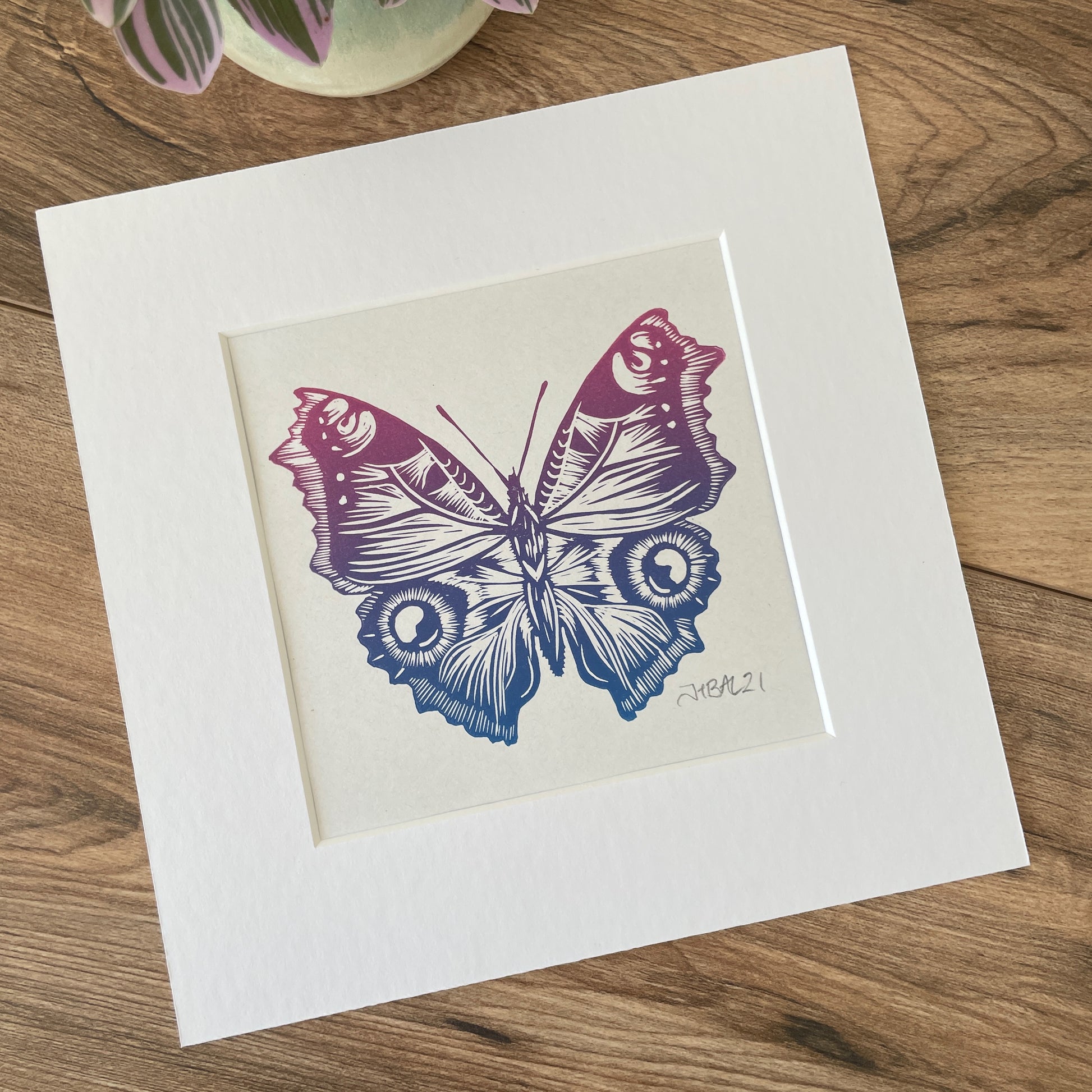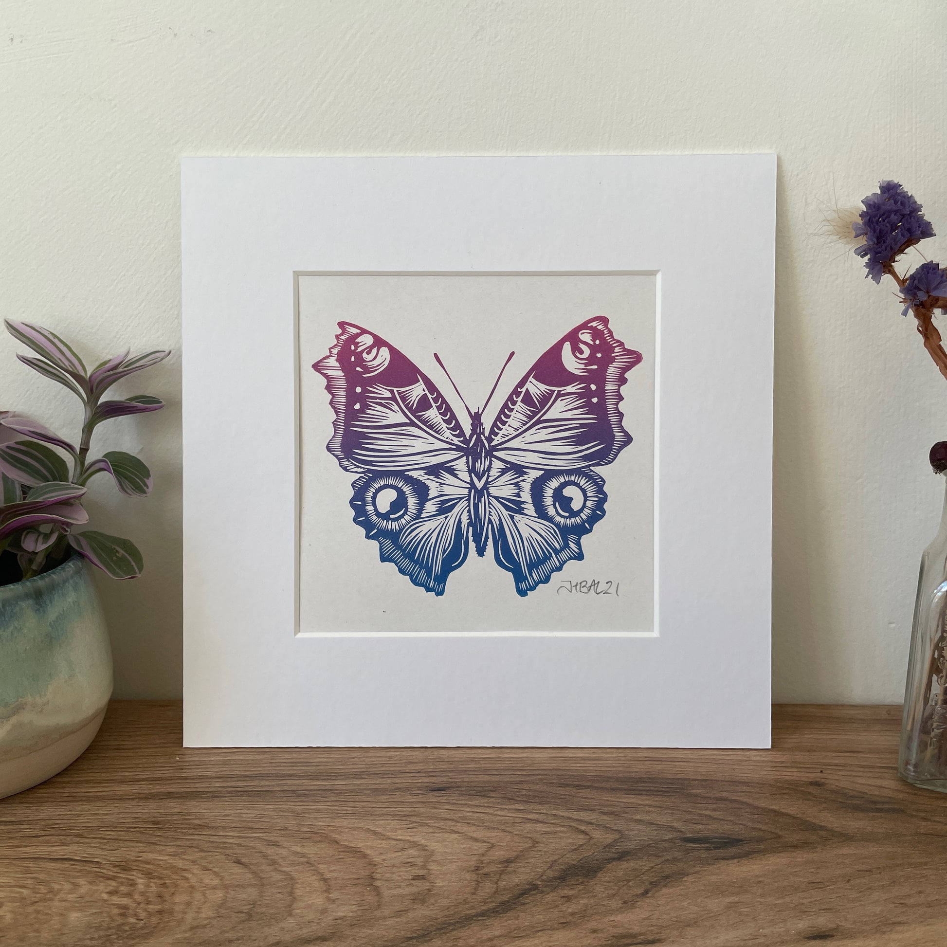 Butterfly Linocut art print, hand printed peacock butterfly by Jackdaw and Bear