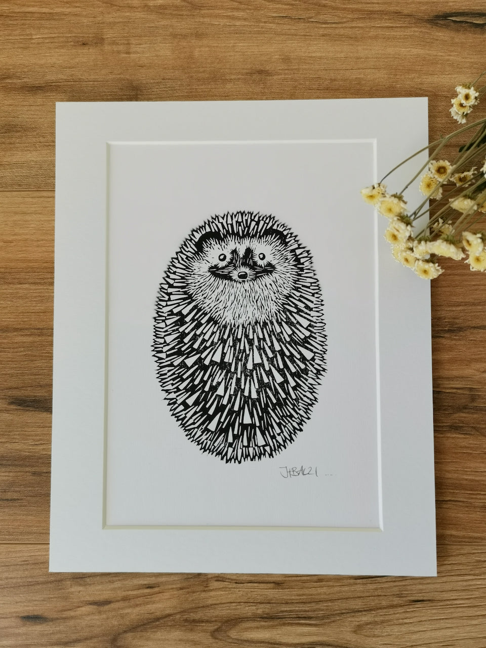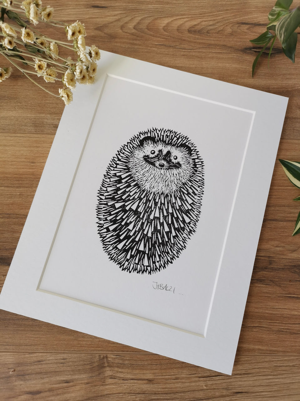 Hand made original linocut print of a European hedgehog, Erinaceus europaeus.