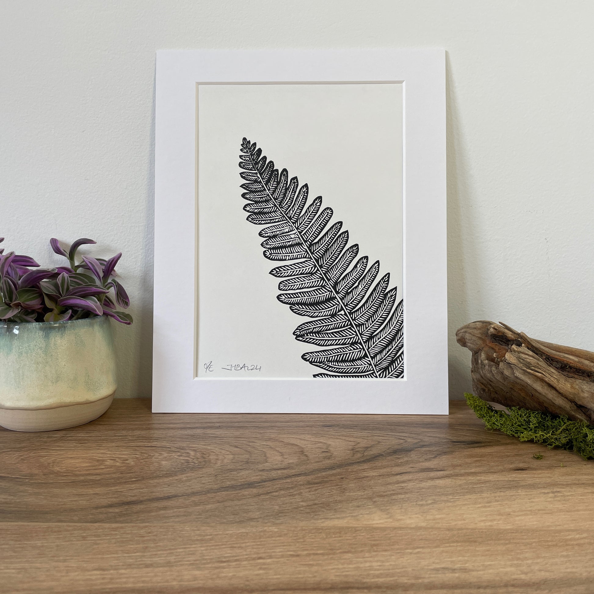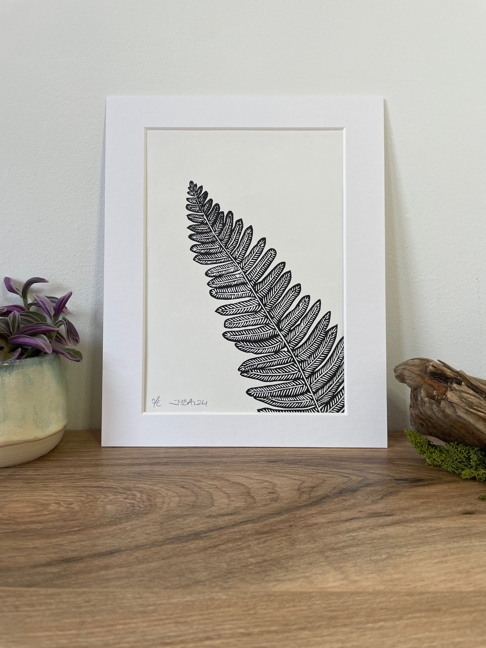 This original linocut art print is hand-pressed with love! Featuring a leafy deer fern inspired by our North Downs countryside strolls, it’s printed in rich black block ink on high-quality printmaking paper.