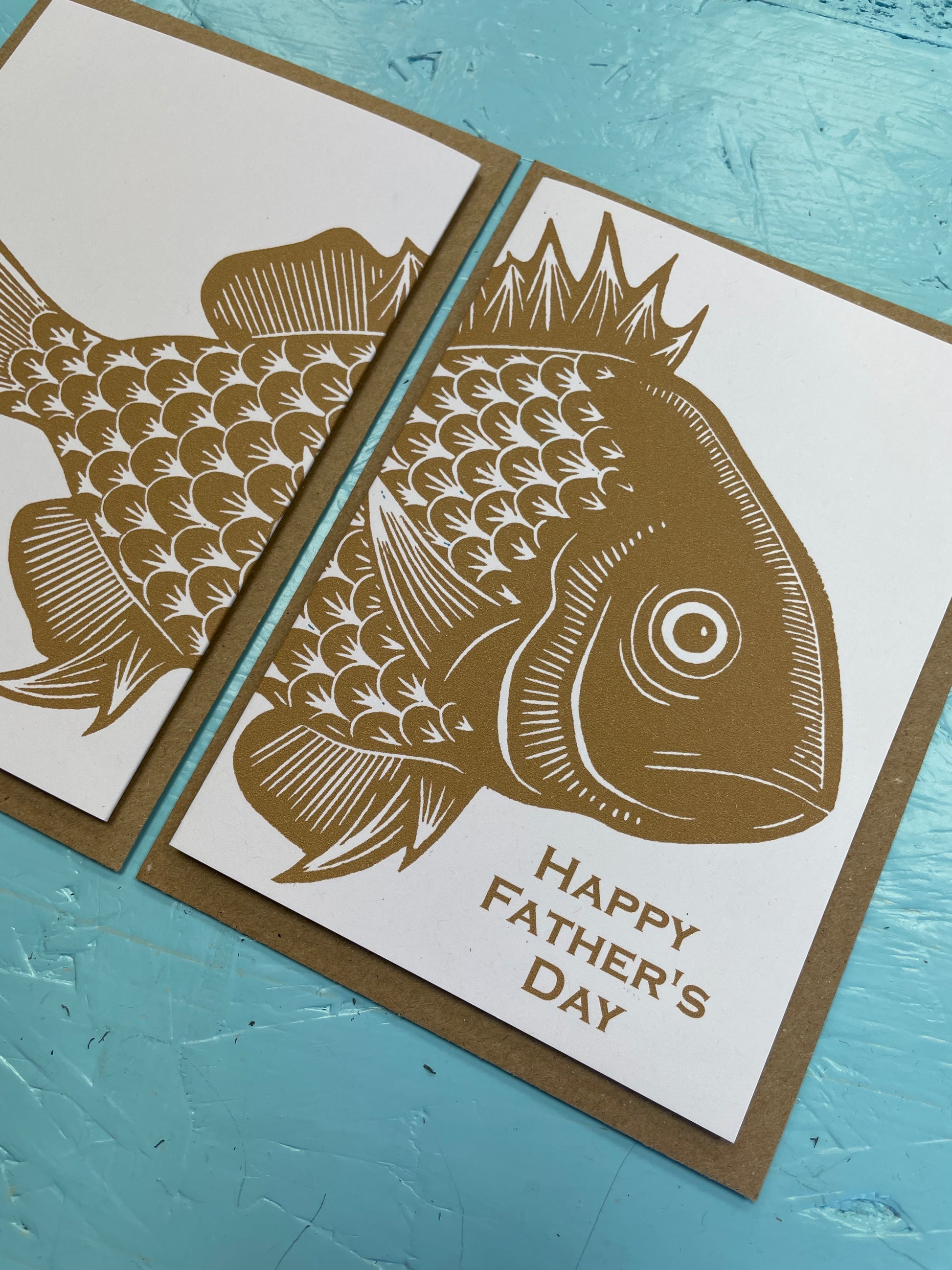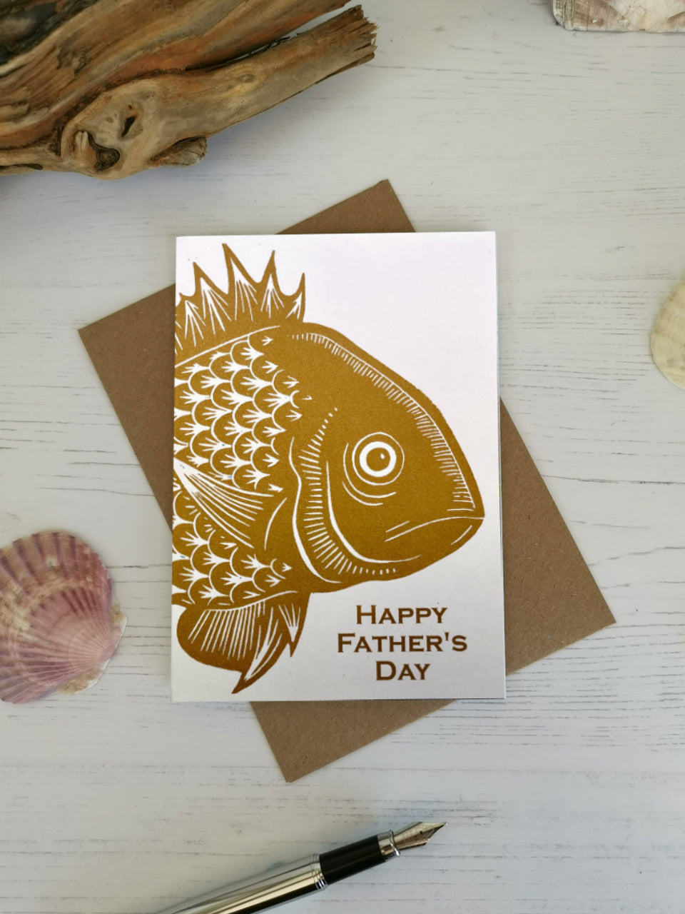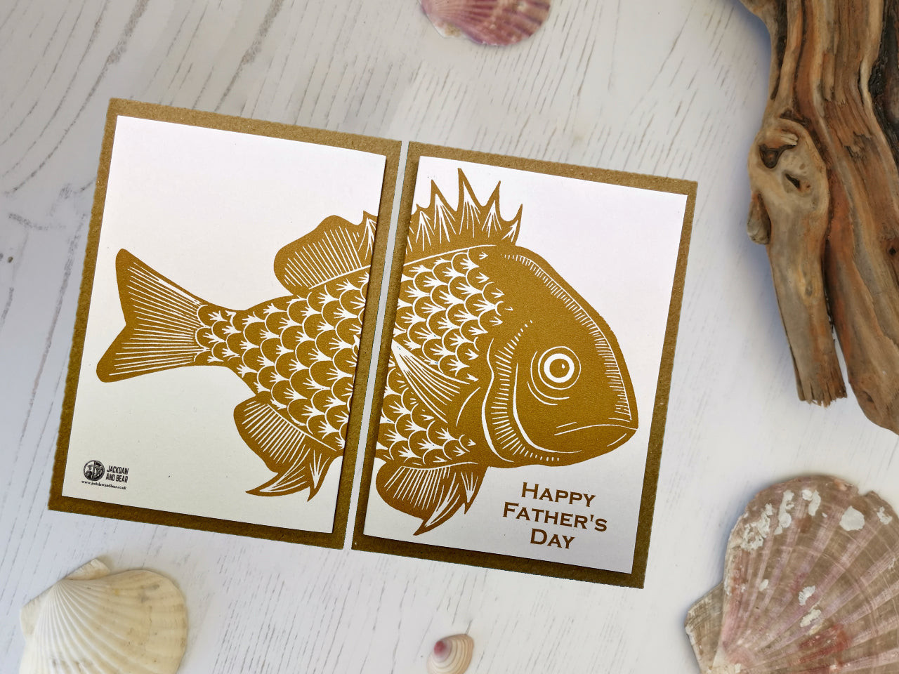 Send your dad, Father’s Day wishes with our fish linocut illustrated Father’s Day card.
