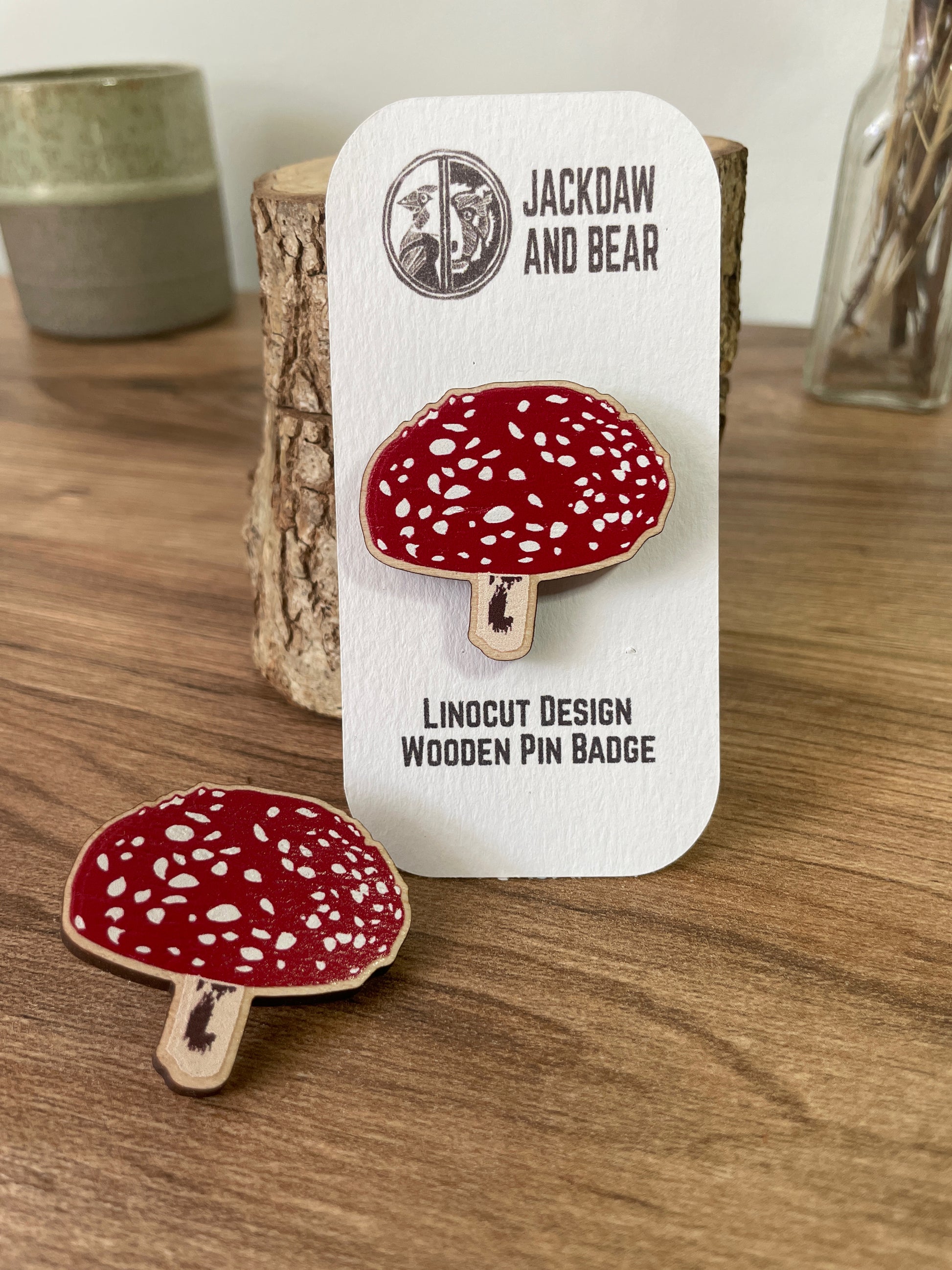 Fly Agaric Fungi Wooden Pin Badge - toadstool, nature brooch.