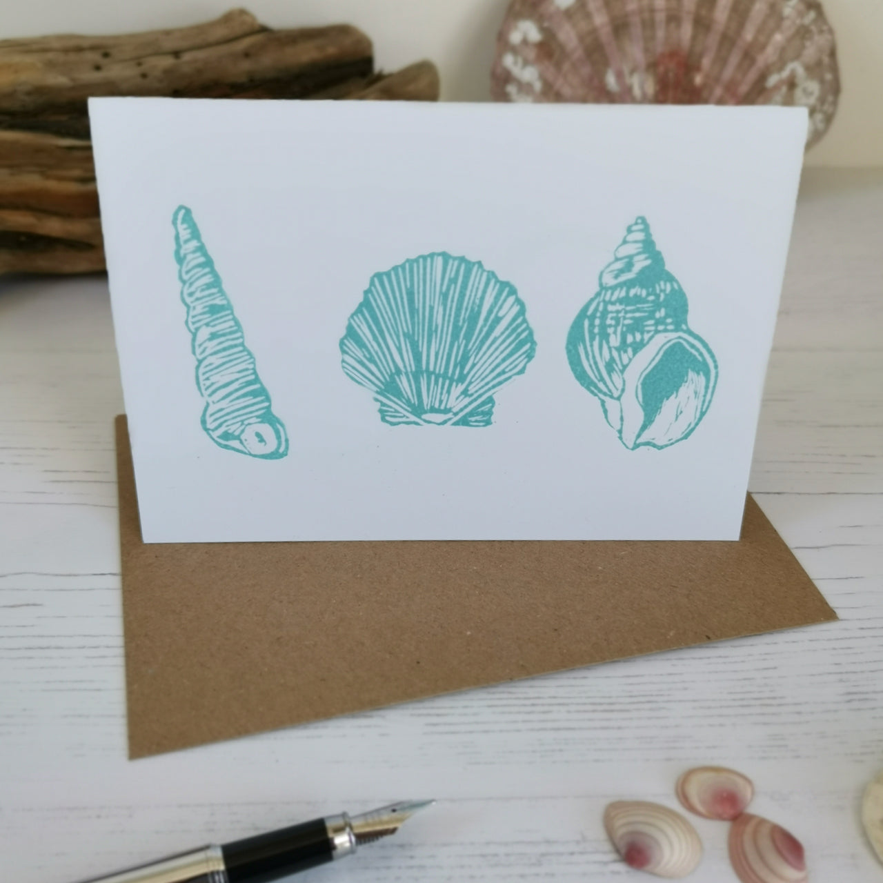 Hand printed seashore shell greeting card, Lino cut print blank card, birthday card, thank you card