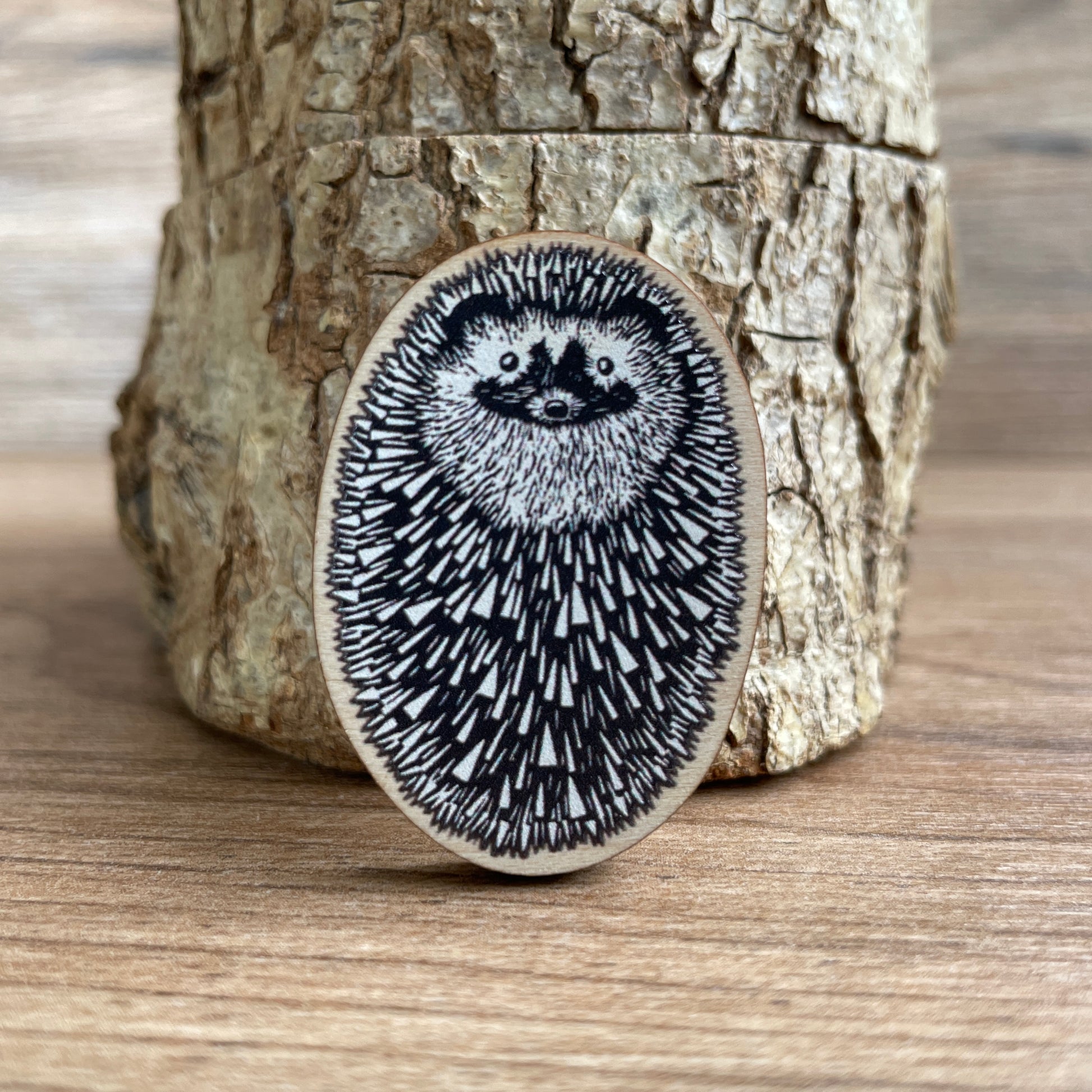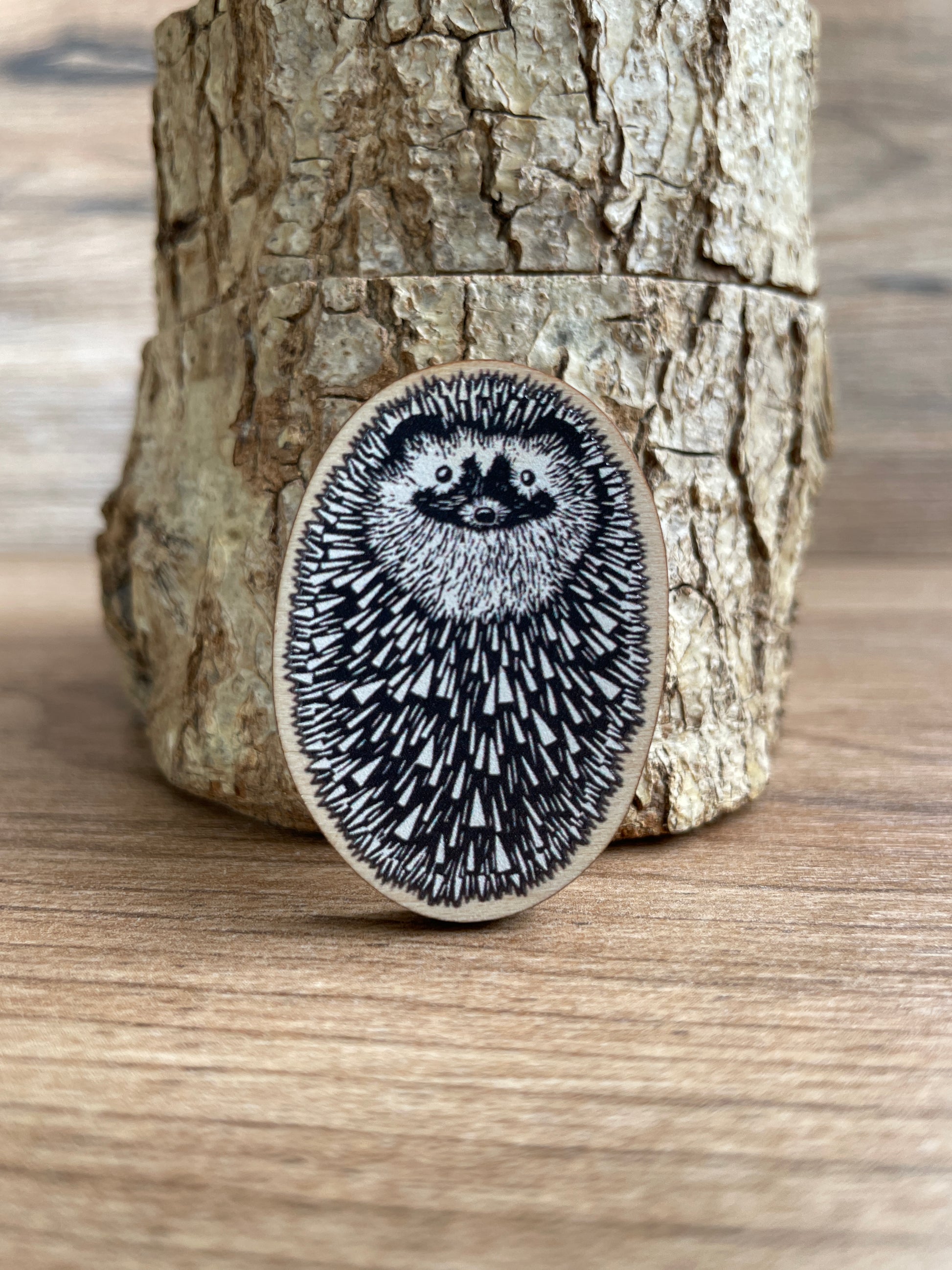 Hedgehog Wooden Pin Badge - animal, nature brooch.