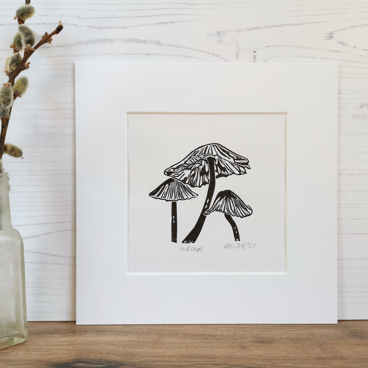 This mini lino print of an Inkcap toadstool is inspired by fungi spotting in U.K woodlands. Printed by hand they are an ideal present for nature lovers and those interested in natural history.