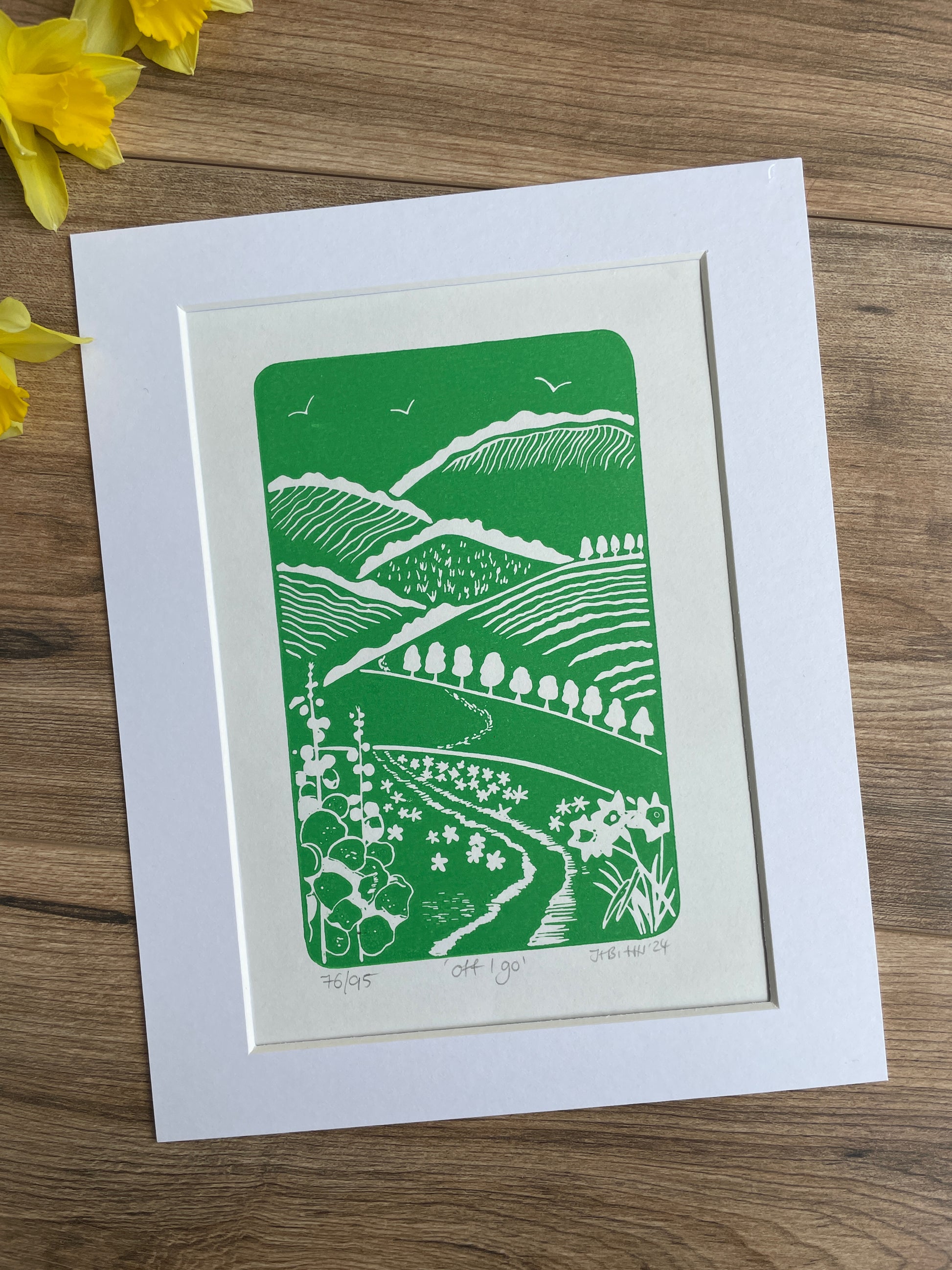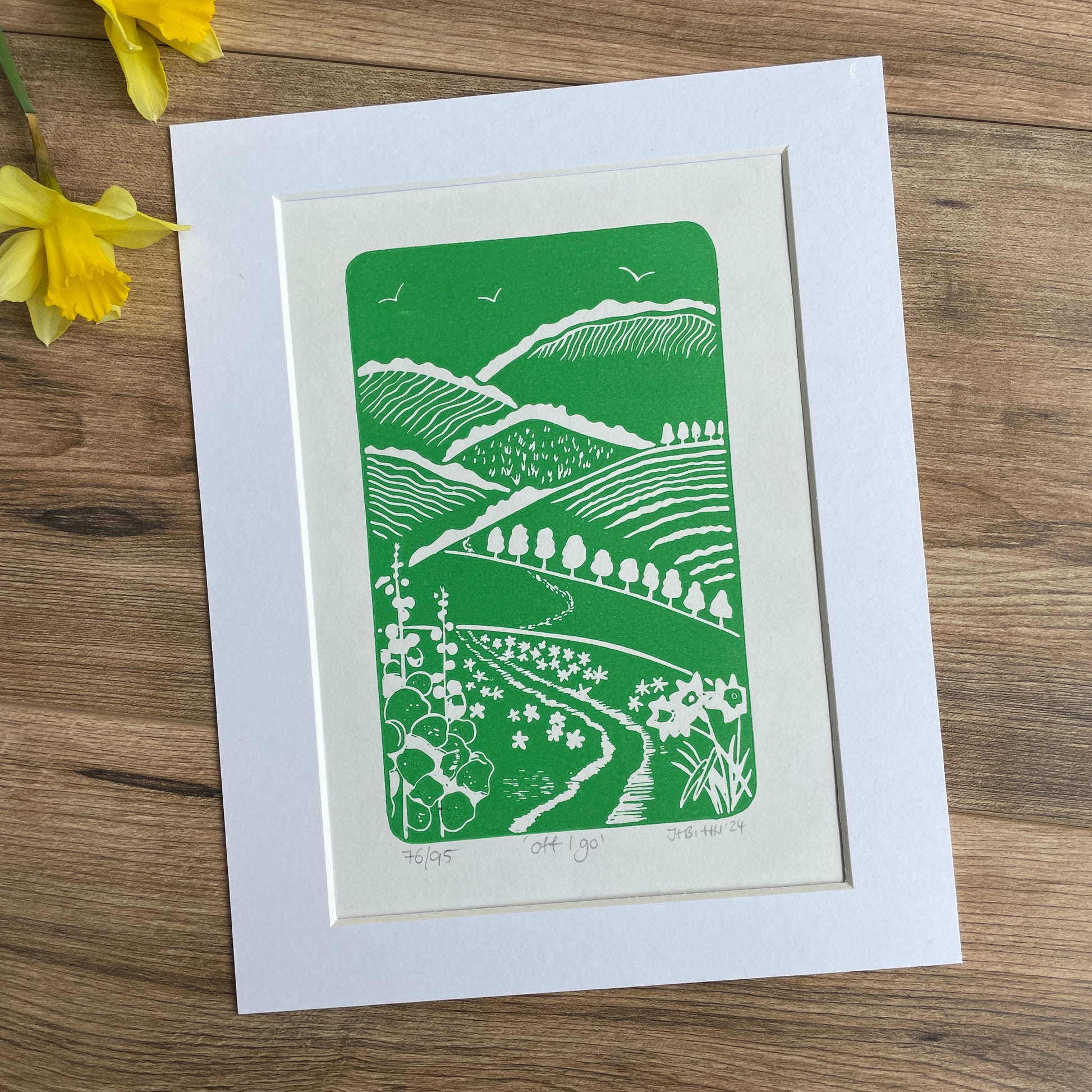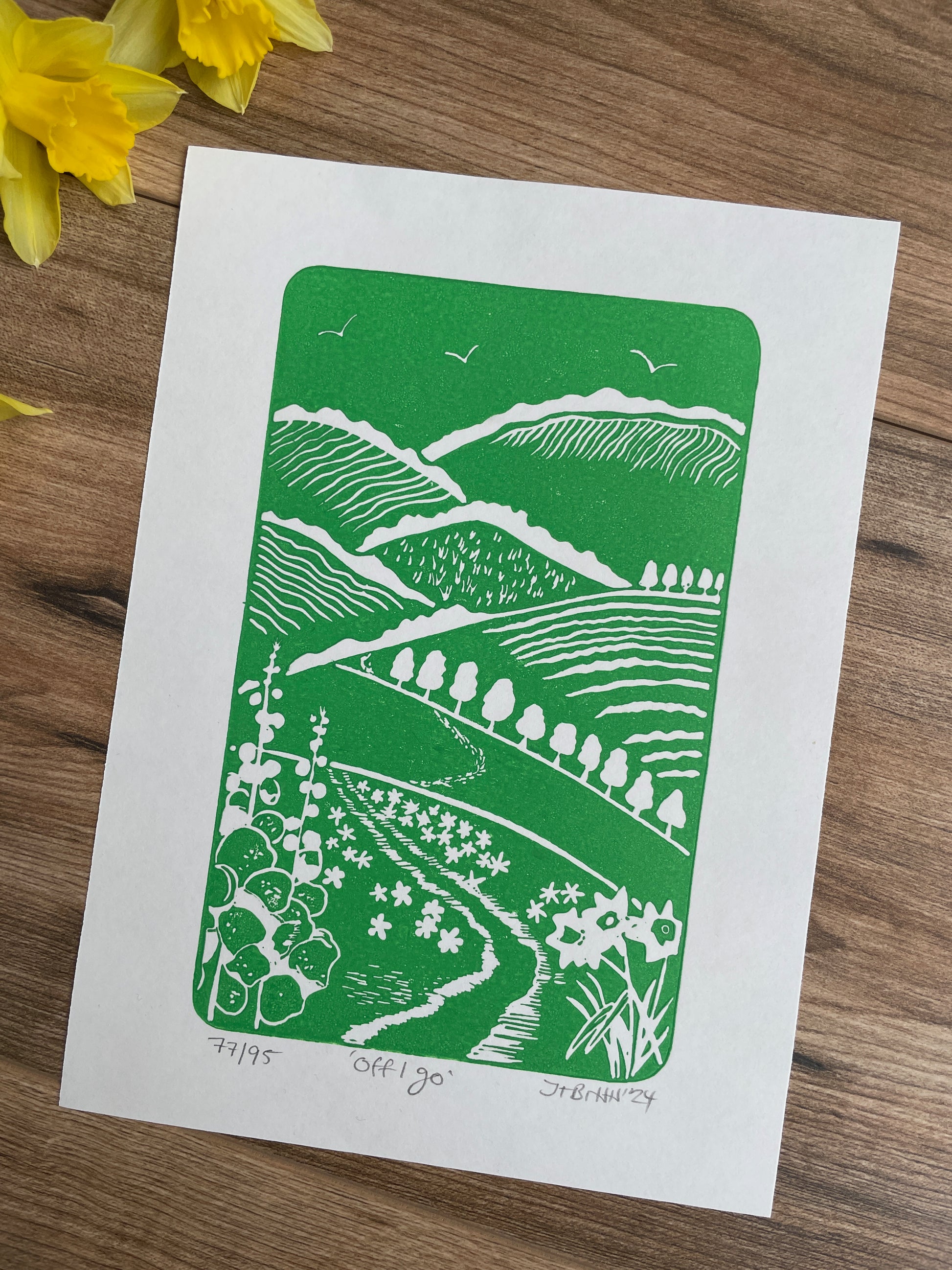 Printed in a bright spring green using block ink on quality printmaking paper.