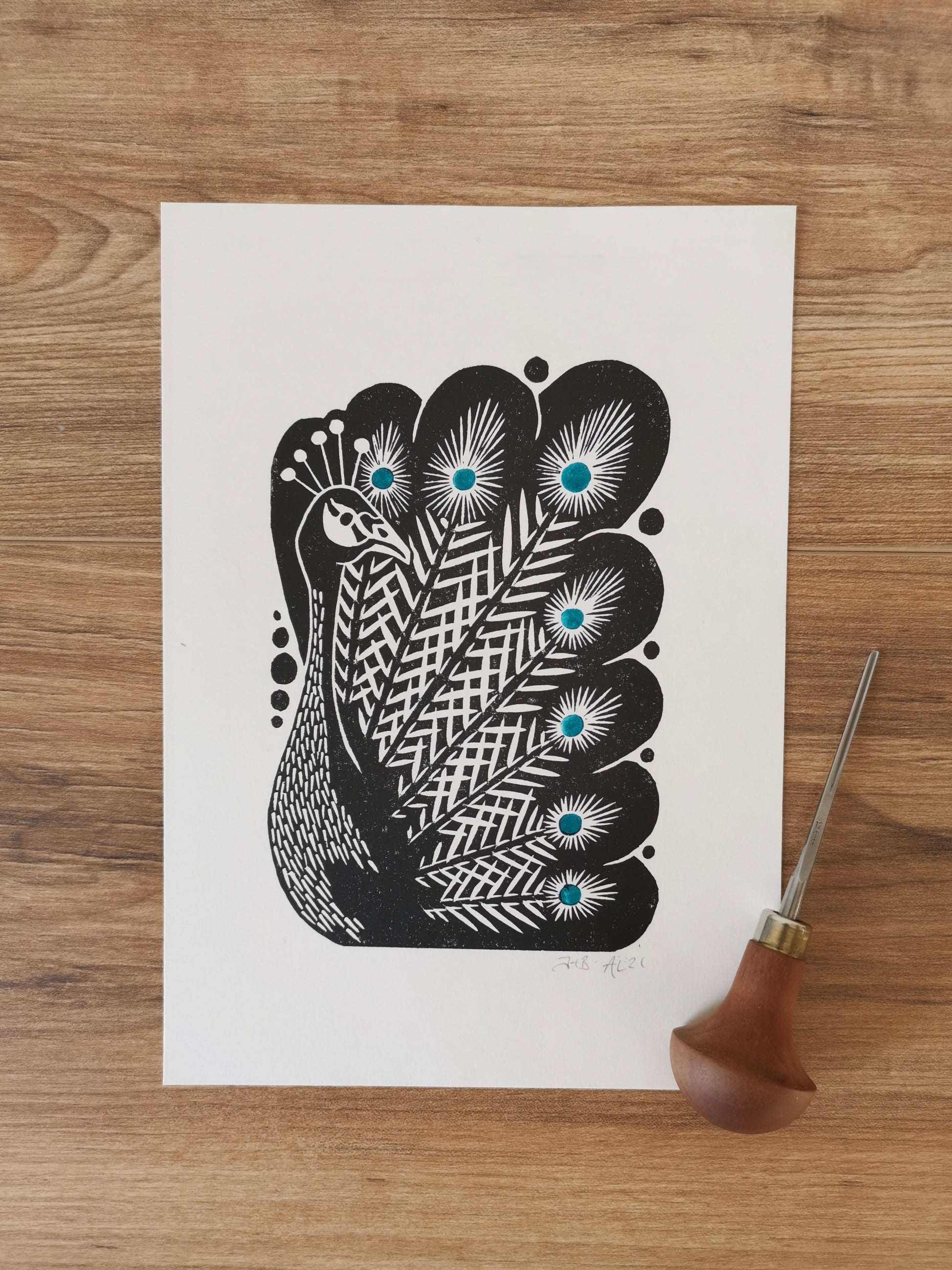 This folksy style lino print of a Peacock, printed by hand, is a perfect birthday gift or thinking of you treat for anyone who loves birds, nature and wildlife.