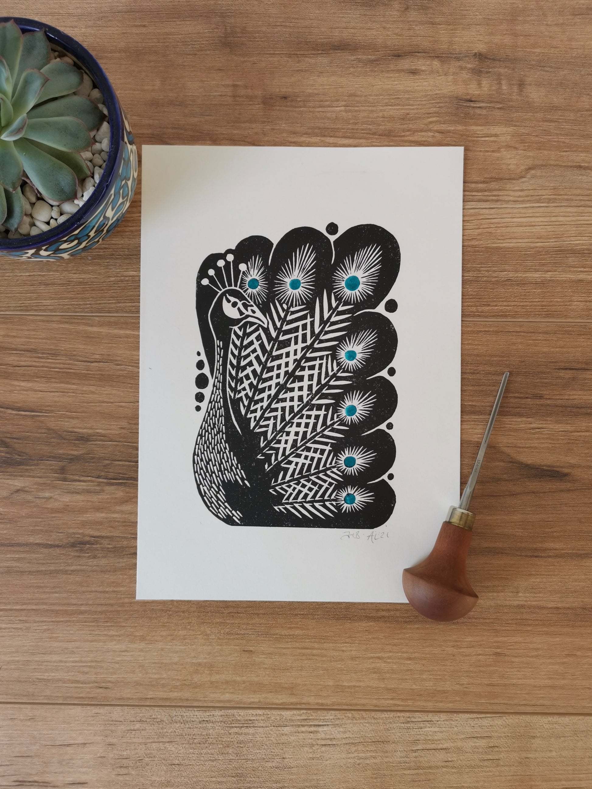 Peacock bird folksy style hand printed linocut nature art print