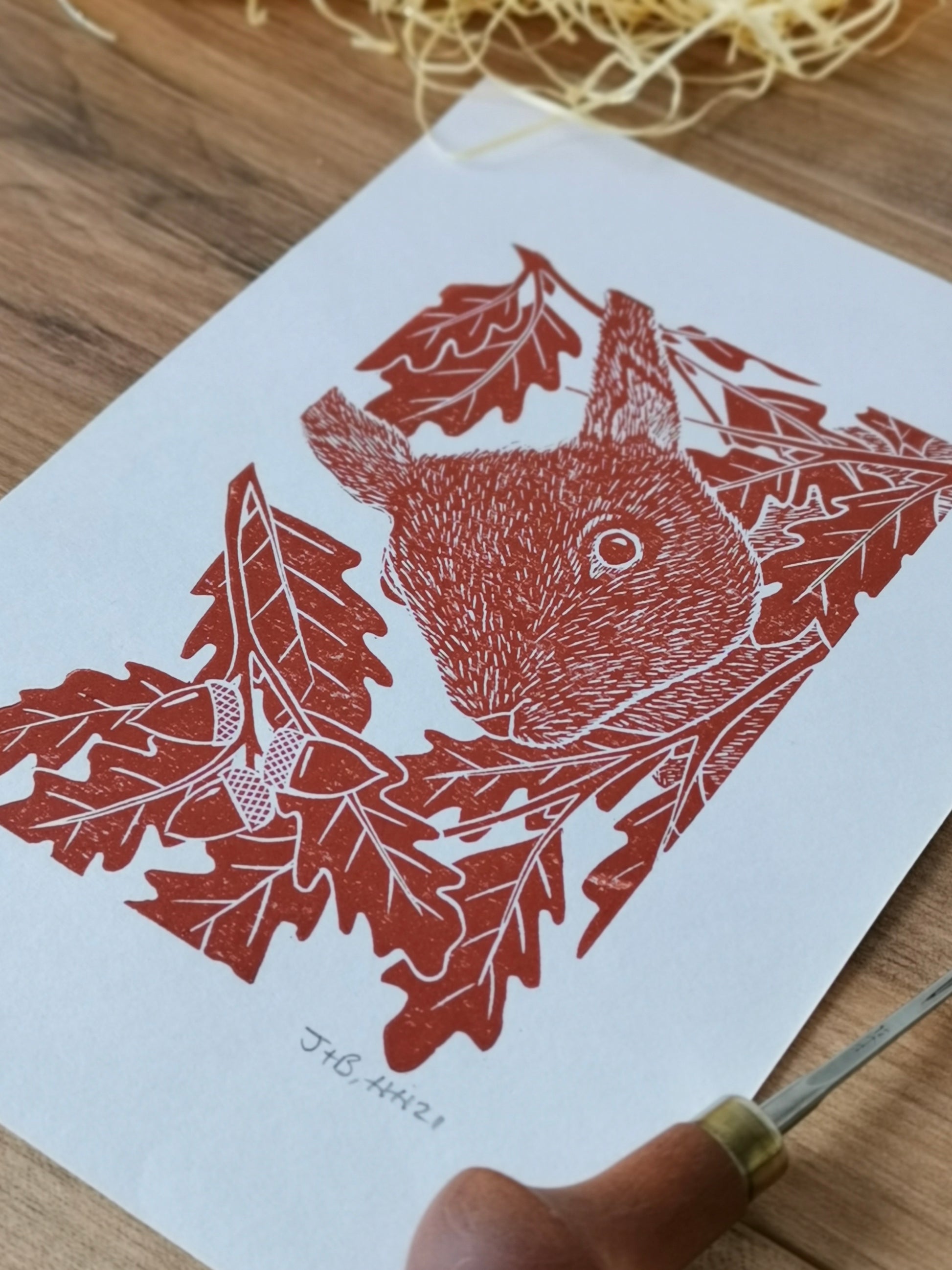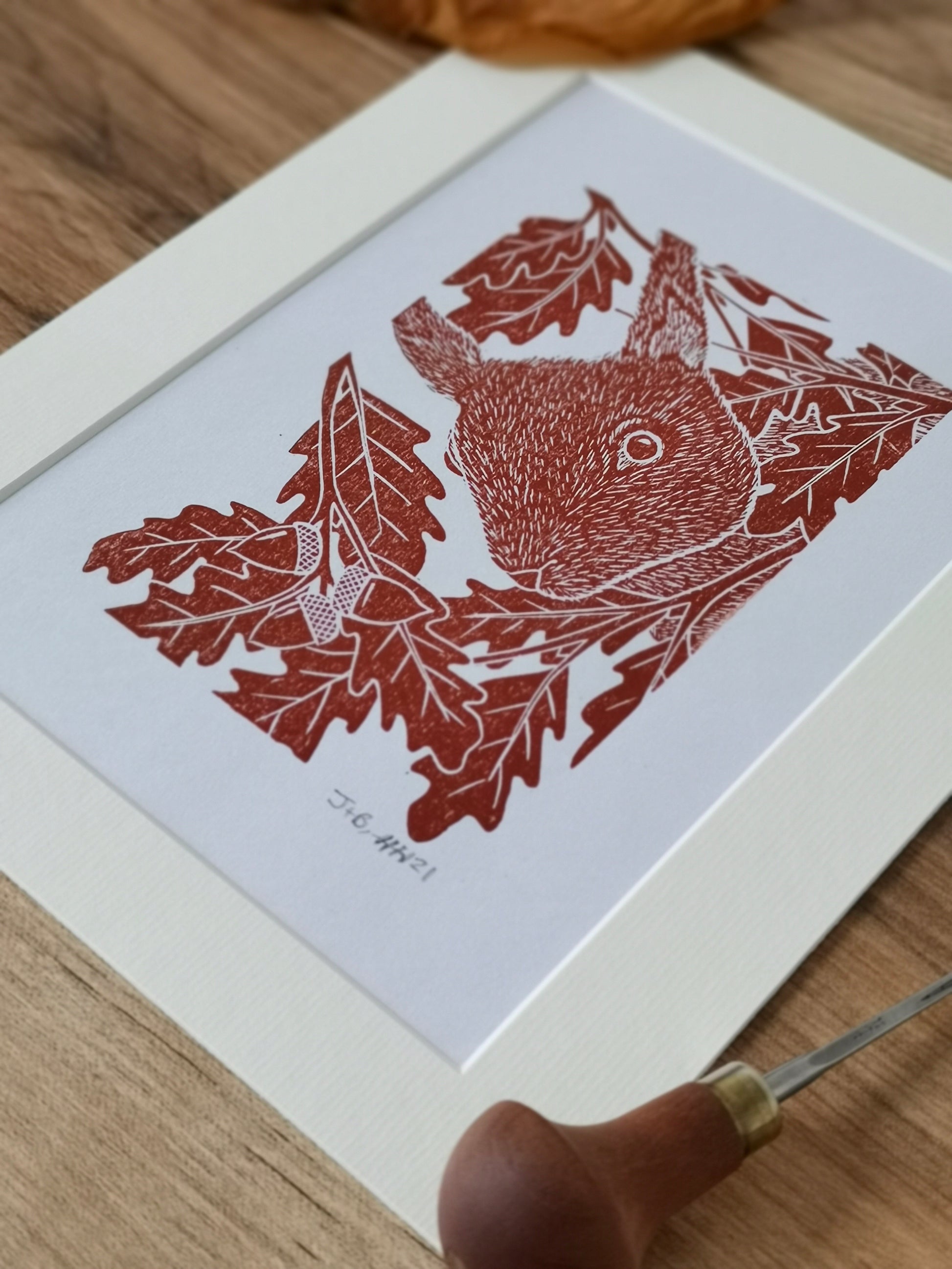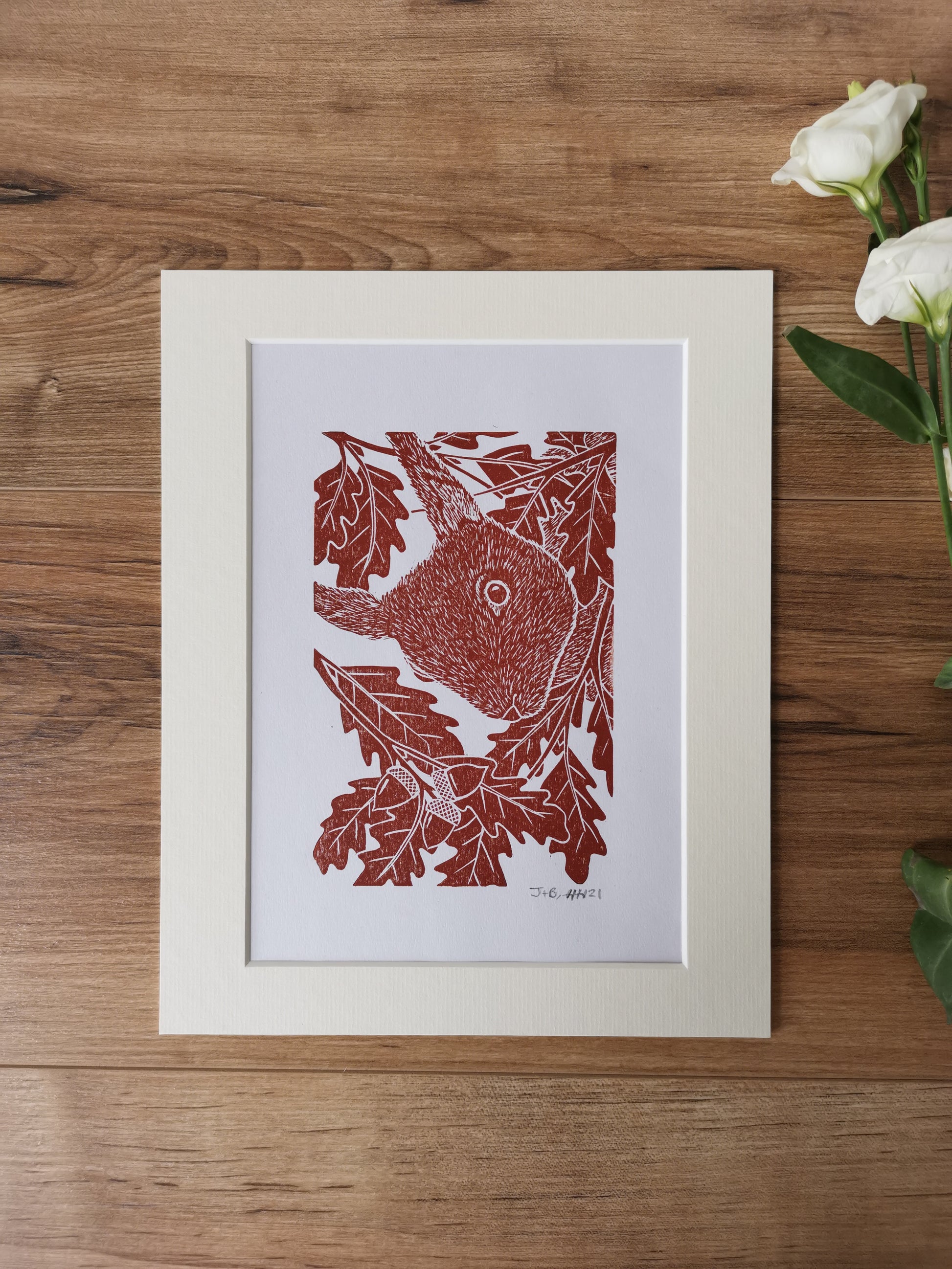 This lino print of a red squirrel peeking at acorns amongst oak leaves, printed by hand, is a perfect birthday present or gift for all occasions for anyone who loves squirrels, nature and wildlife.