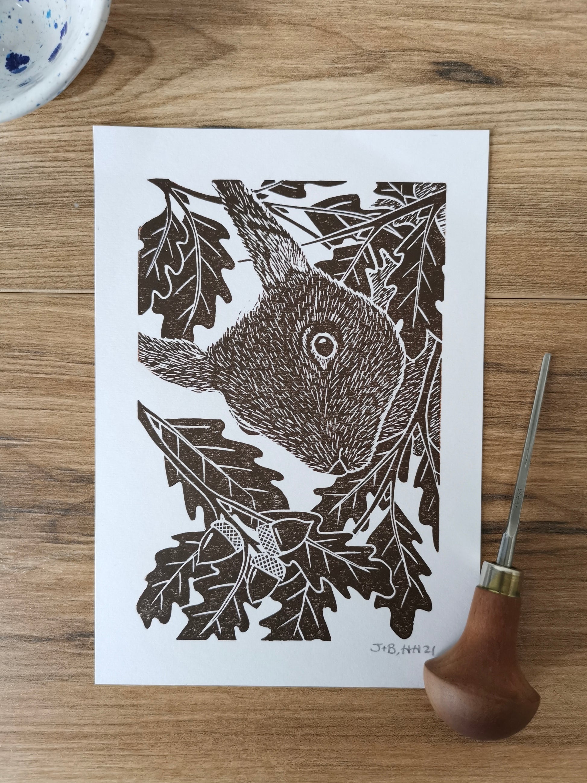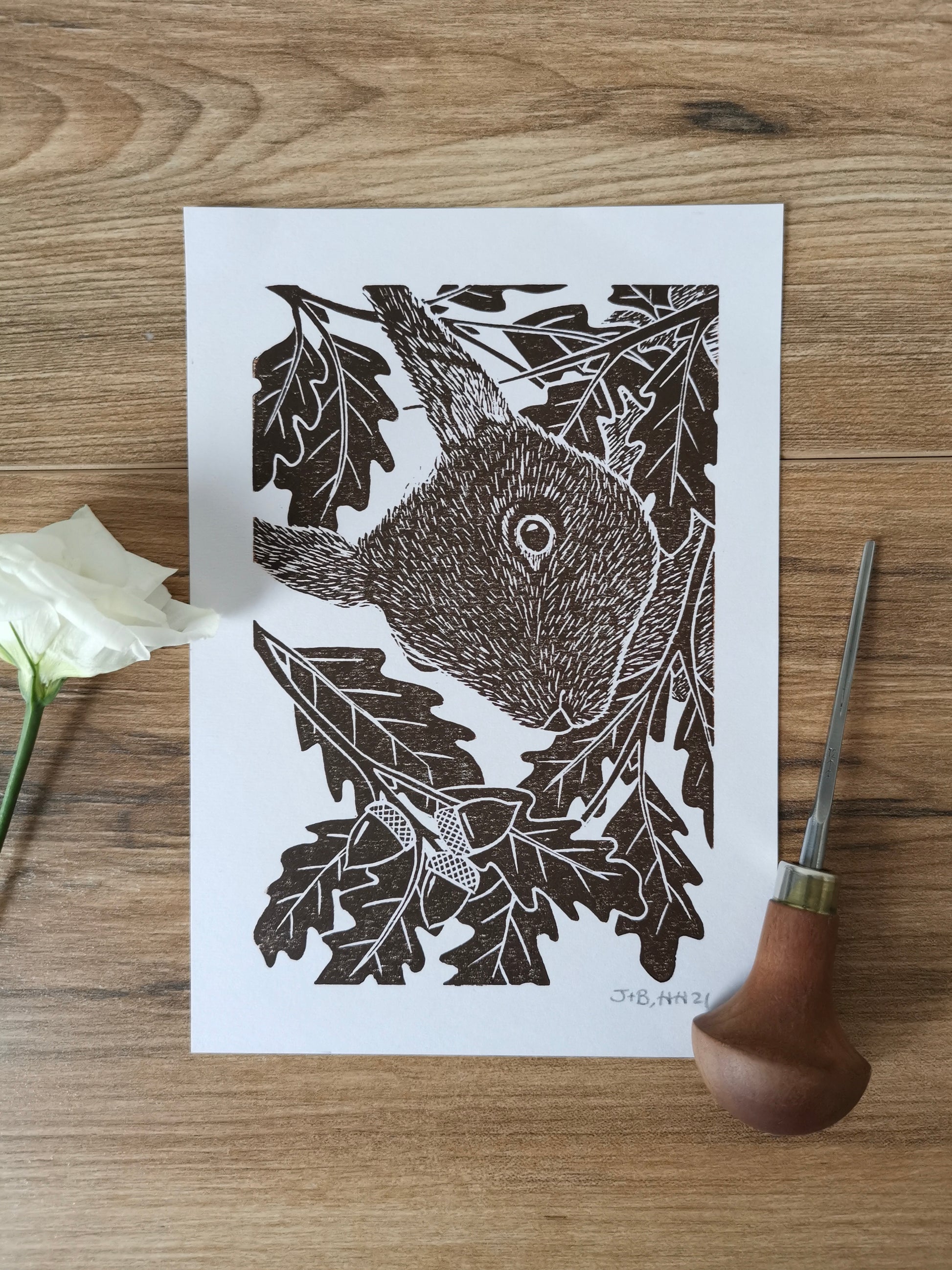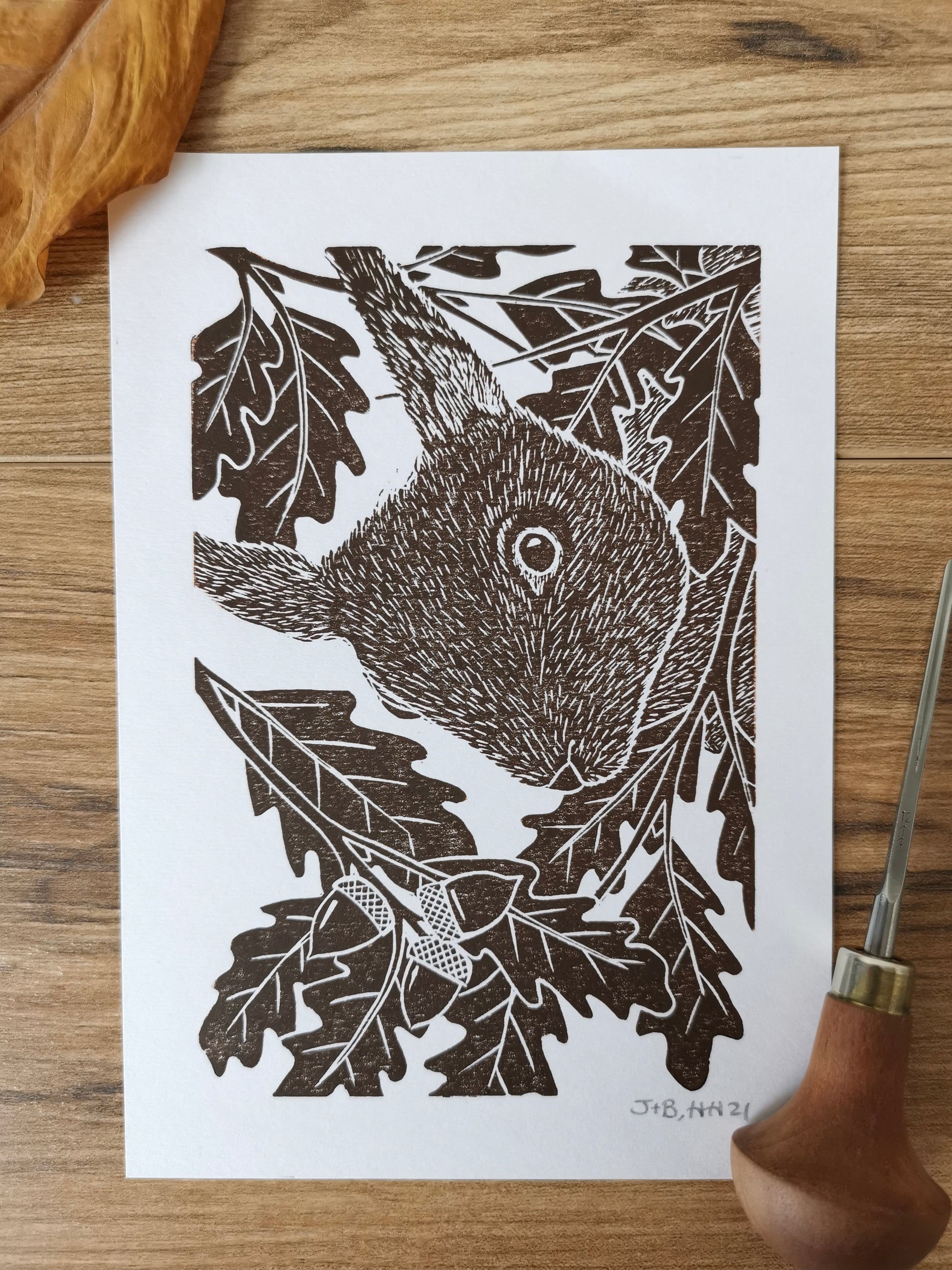 This lino print of a red squirrel peeking at acorns amongst oak leaves, printed by hand, is a perfect birthday present or gift for all occasions for anyone who loves squirrels, nature and wildlife.
