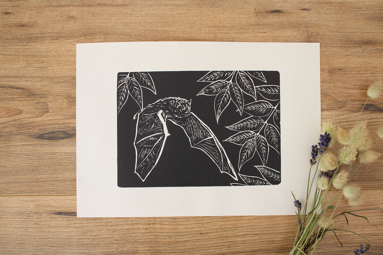 This lino print of a bat in flight, printed by hand, is a perfect birthday present or gift for anyone who loves bats, nature and wildlife.