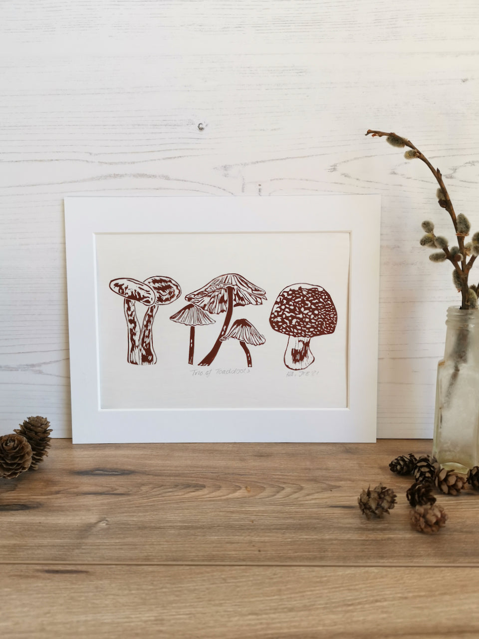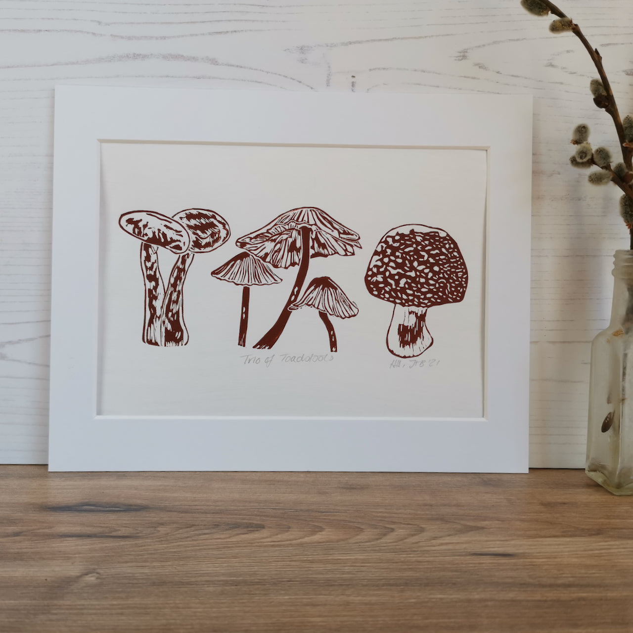 Trio of Toadstools art print - hand printed linocut autumn print wall decor