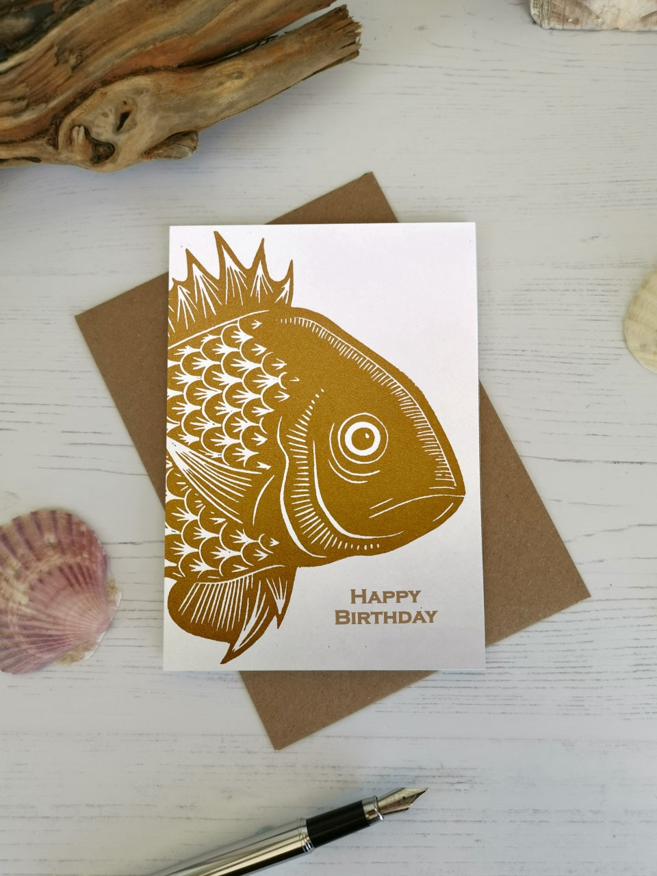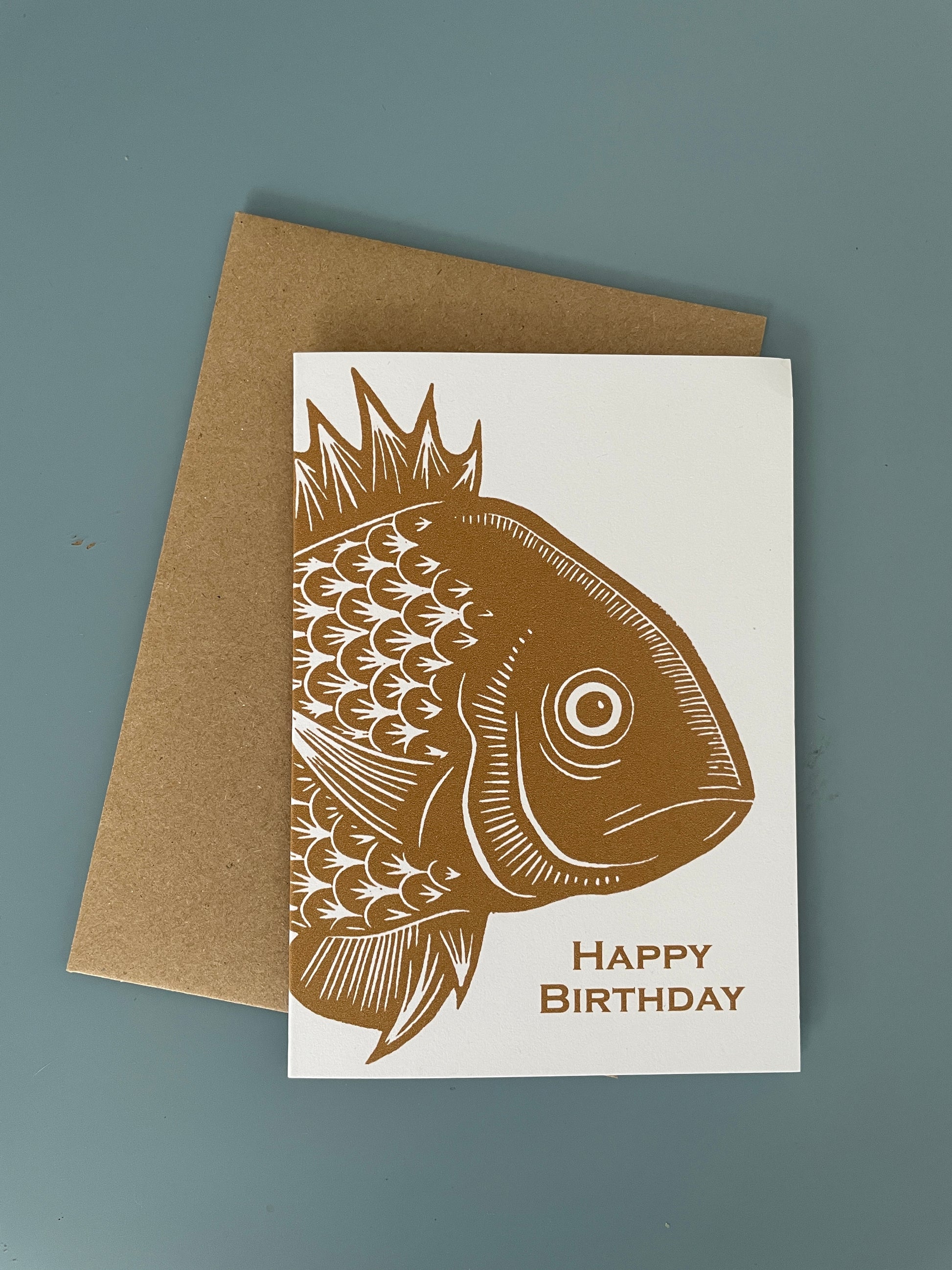 Send birthday wishes with our fish linocut illustrated birthday card.