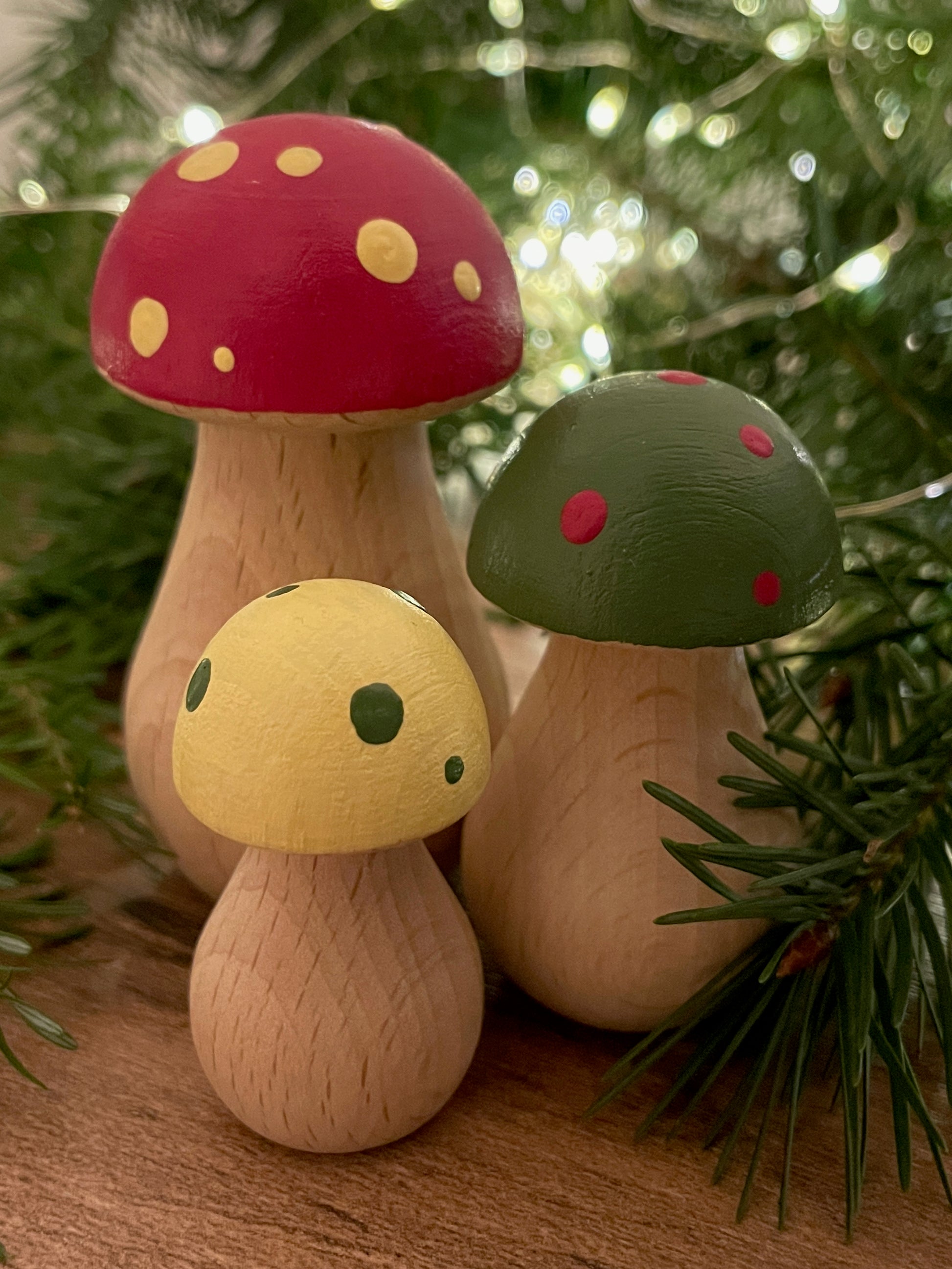 These gorgeously hued wooden fungi ornaments are handcrafted masterpieces, ready to adorn your mantlepiece! Each mini mushroom is hand painted with earthy tones and sealed with a protective coating - gorgeous!