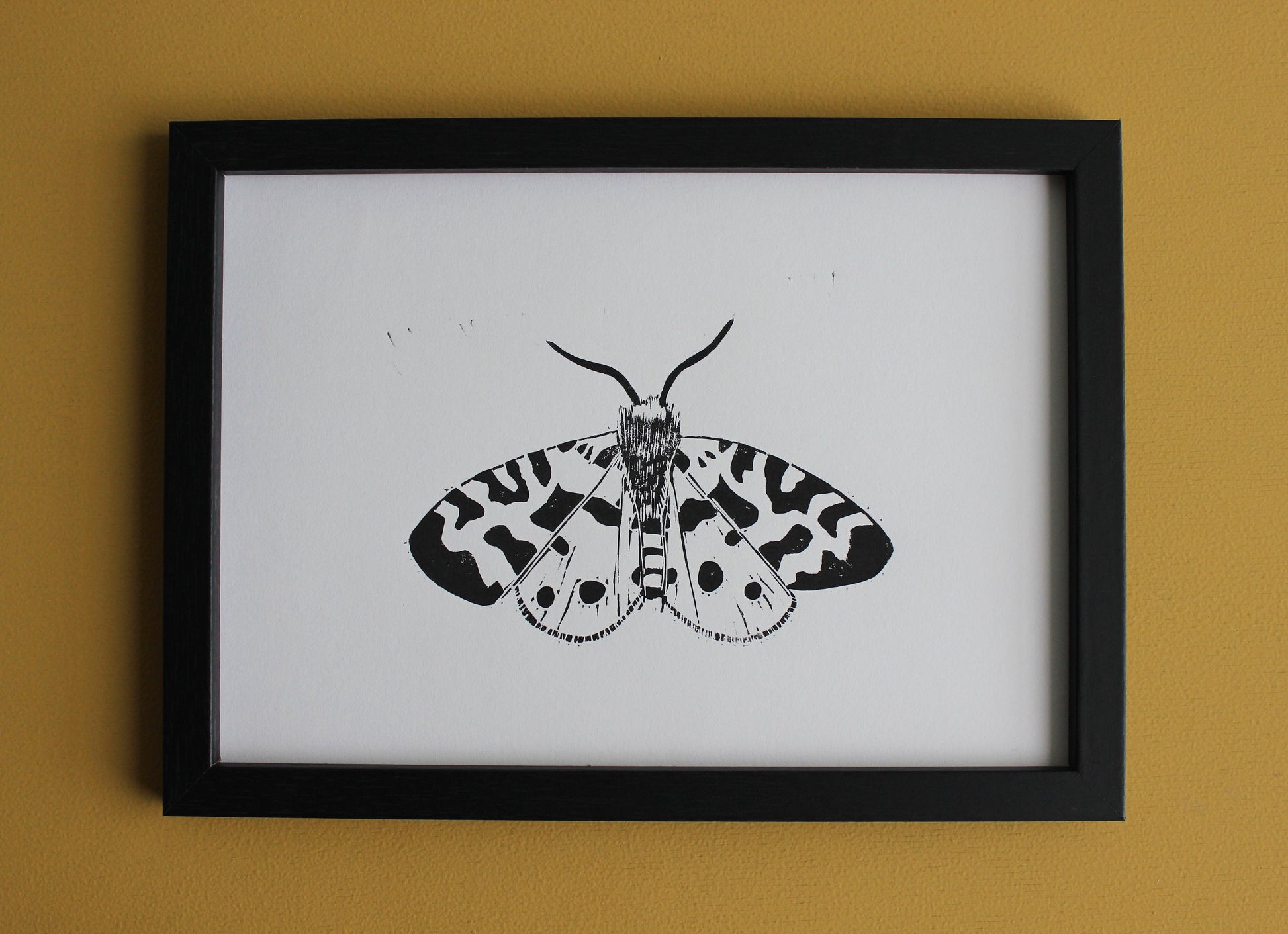 Hand made original linocut print of a Garden Tiger moth, Arctia caja.