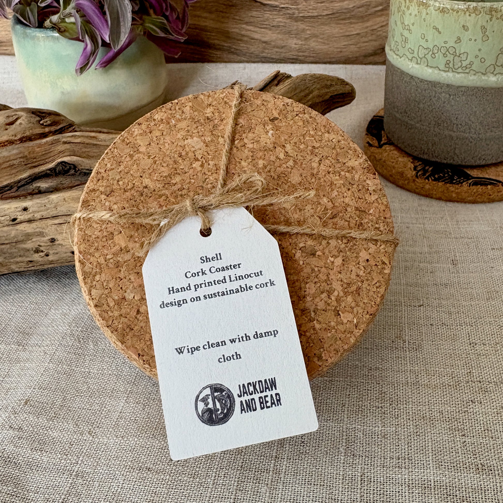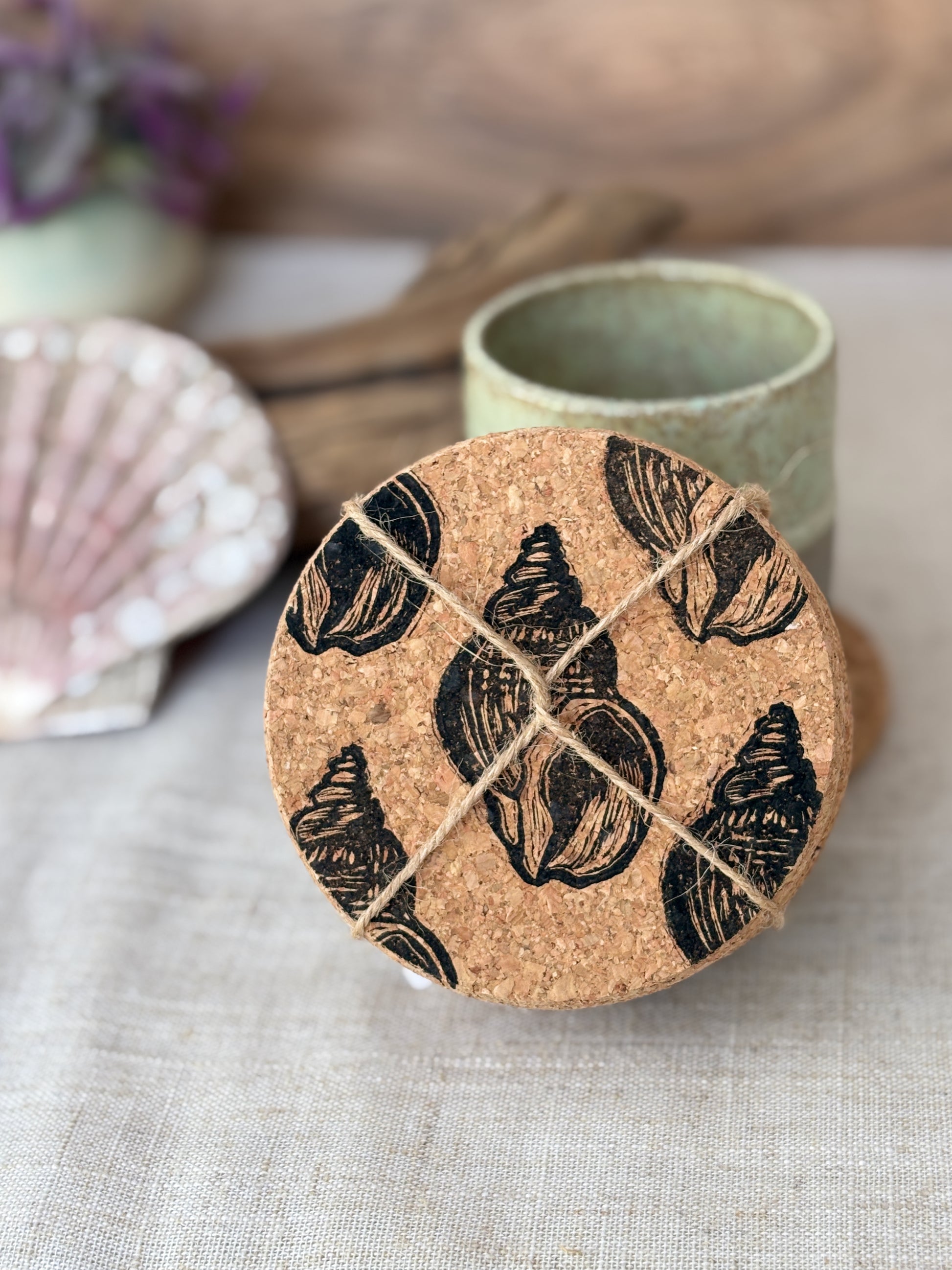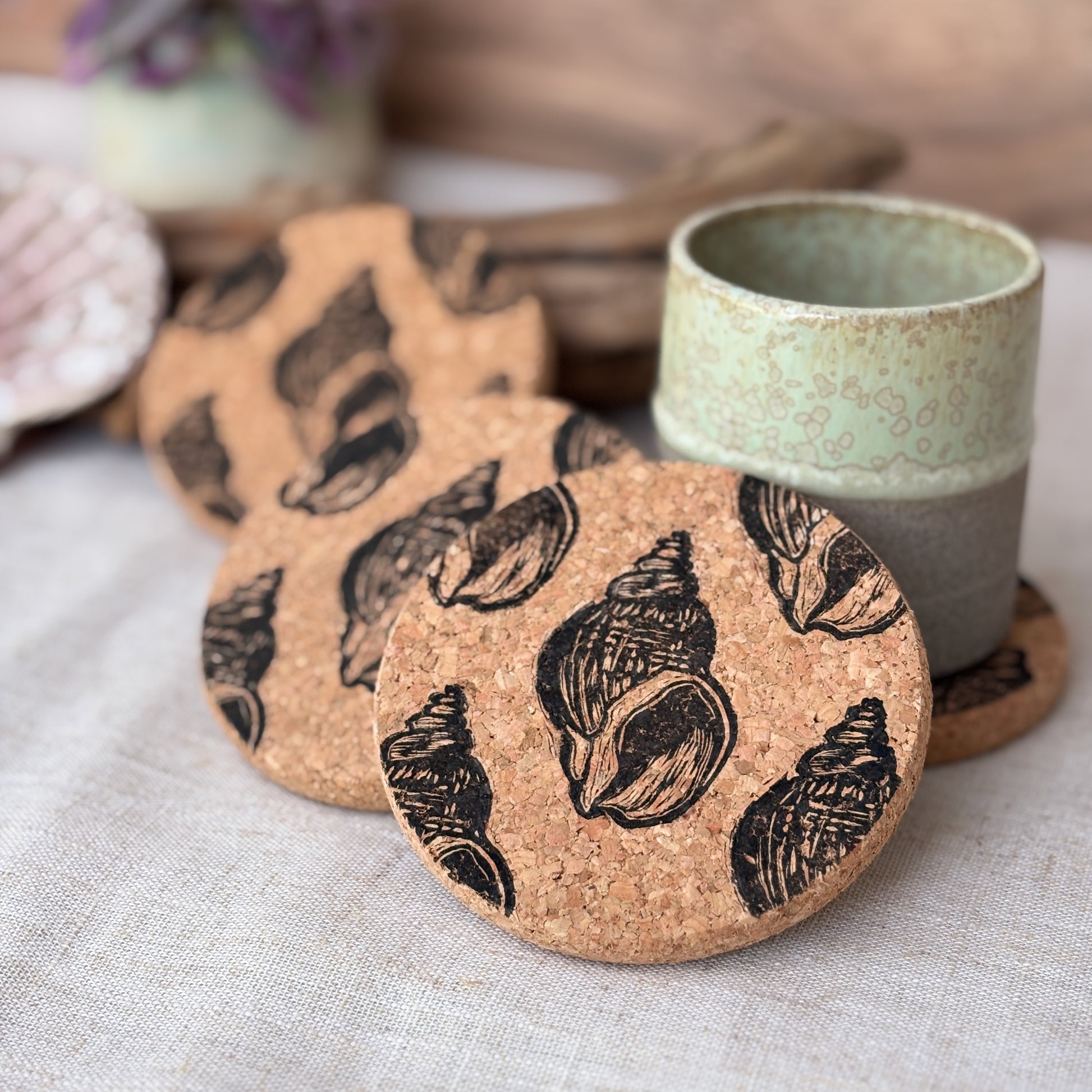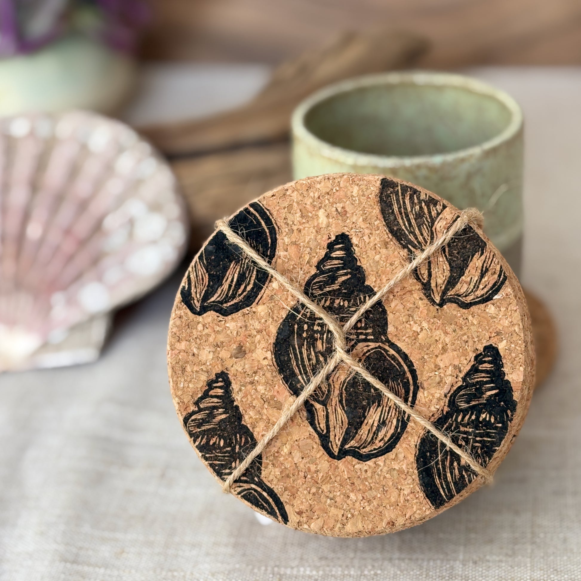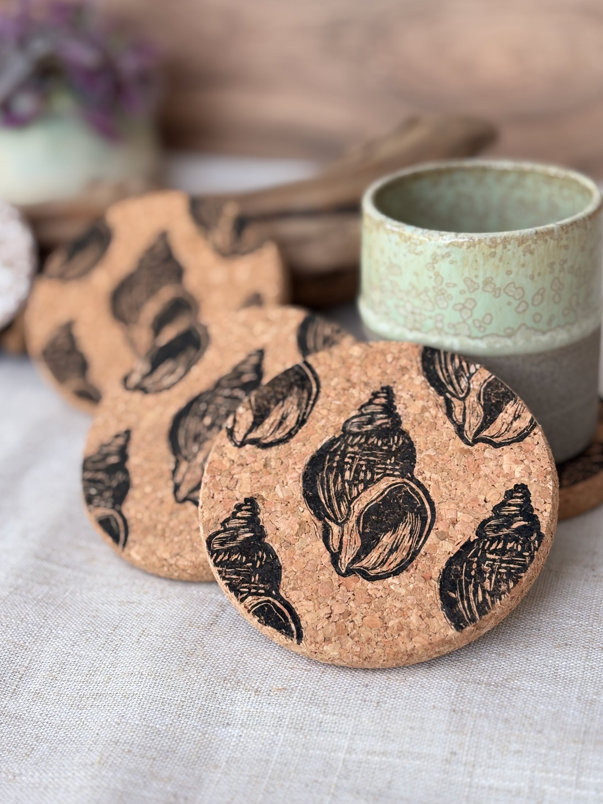 These charming cork coasters feature our playful whelk shell lino cut design, hand printed with care.