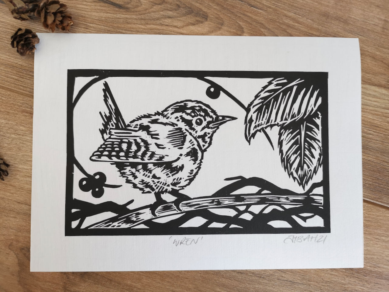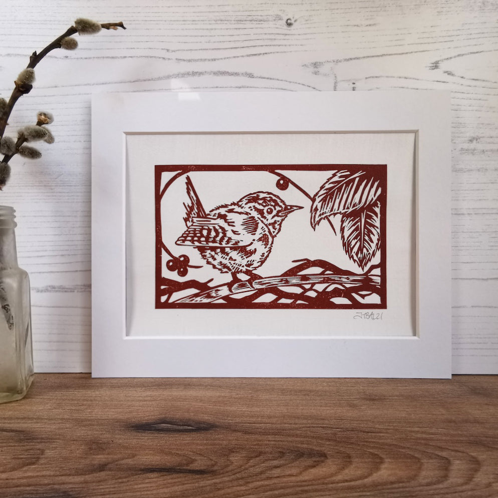 Original hand printed linocut art print of an Eurasian Wren, Troglodytes troglodytes.