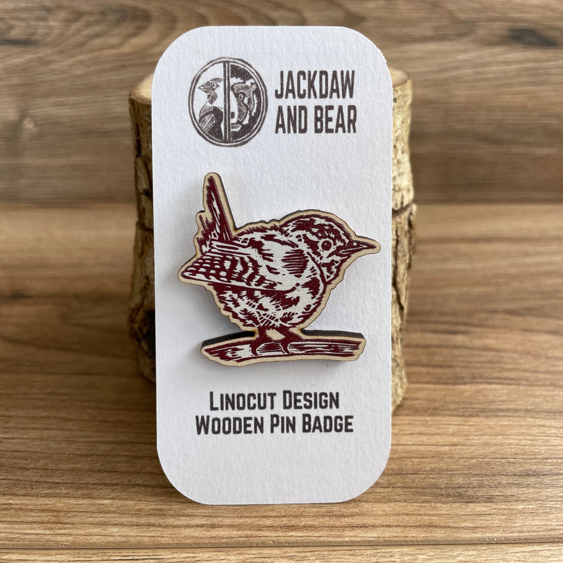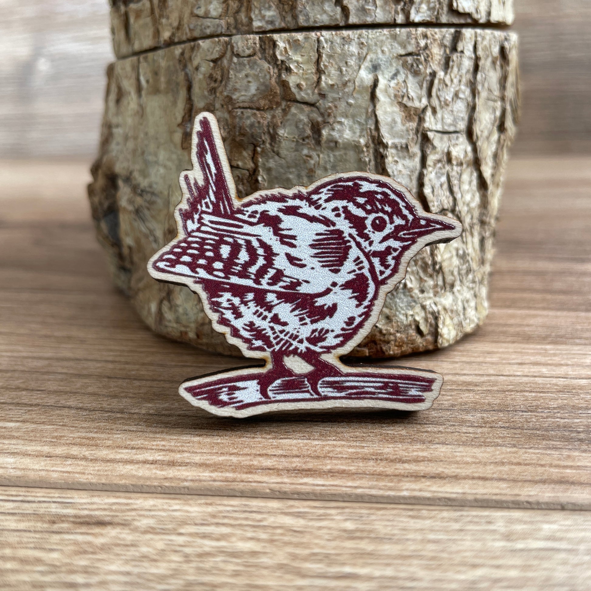 Wren Wooden Pin Badge - animal, bird, nature brooch.